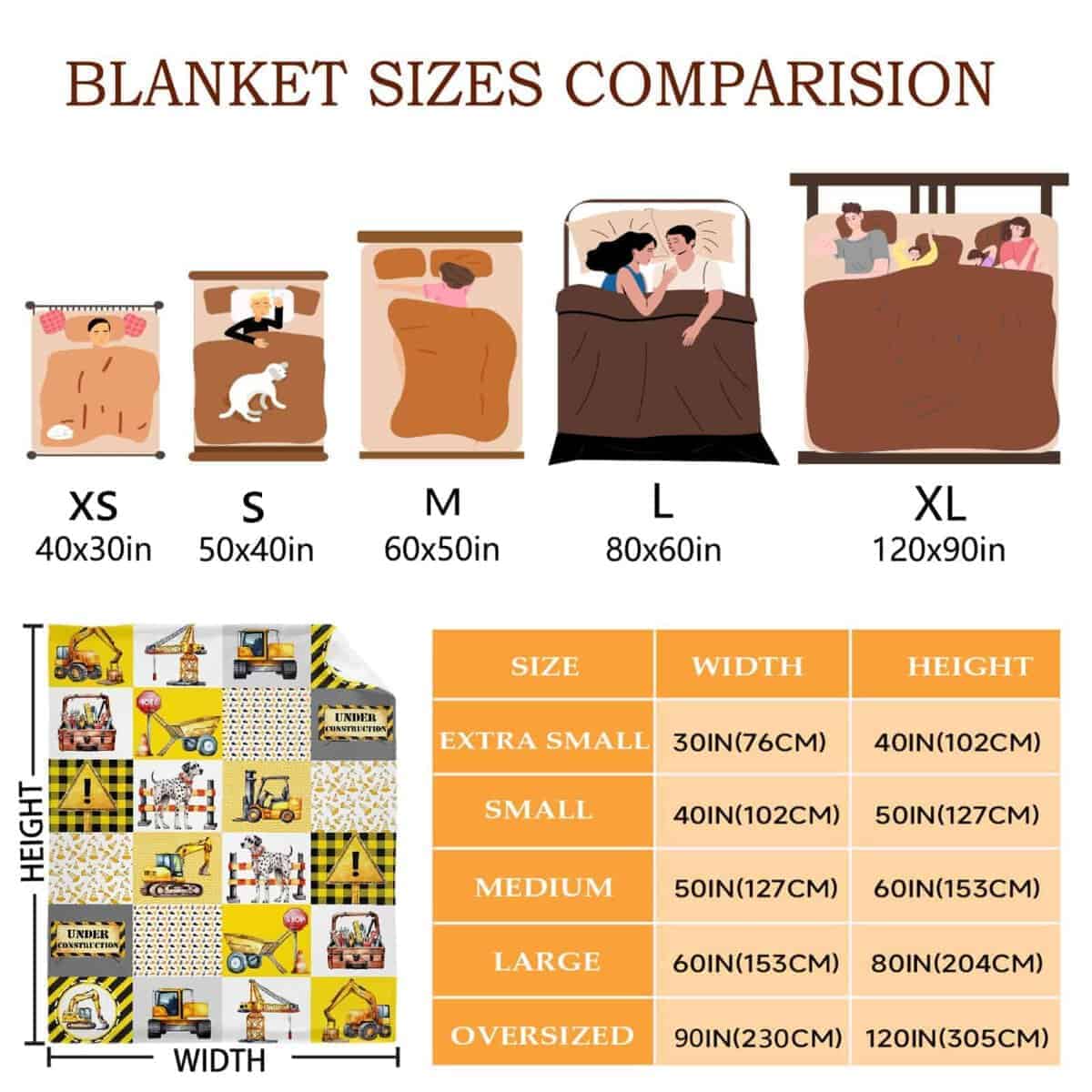 1. Opciones de Tamaño Variadas: Las Mantas de Camión de Construcción están disponibles en una variedad de tamaños. 30 40 pulgadas, disponible para niños o mascotas. 40 50 pulgadas, disponible para niños. 50 60 pulgadas, disponible para adolescentes. 60 80 pulgadas, disponible para adultos. 90 120 pulgadas para familias. Puede elegir el tamaño que le convenga según su situación real.