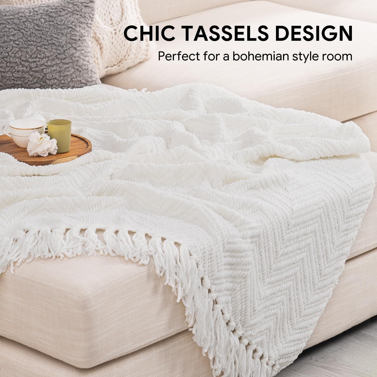 1. Diseño Boho Único – Presentamos nuestra exquisita manta de chenilla de punto con un diseño boho, con patrones de espiga intrincados y colores bien pensados que se combinan en perfecta armonía para crear una obra maestra visual impresionante que realzará sin esfuerzo la estética de cualquier espacio.