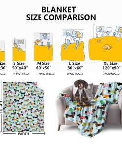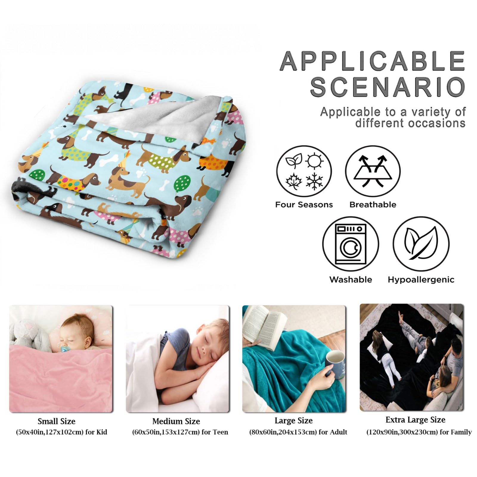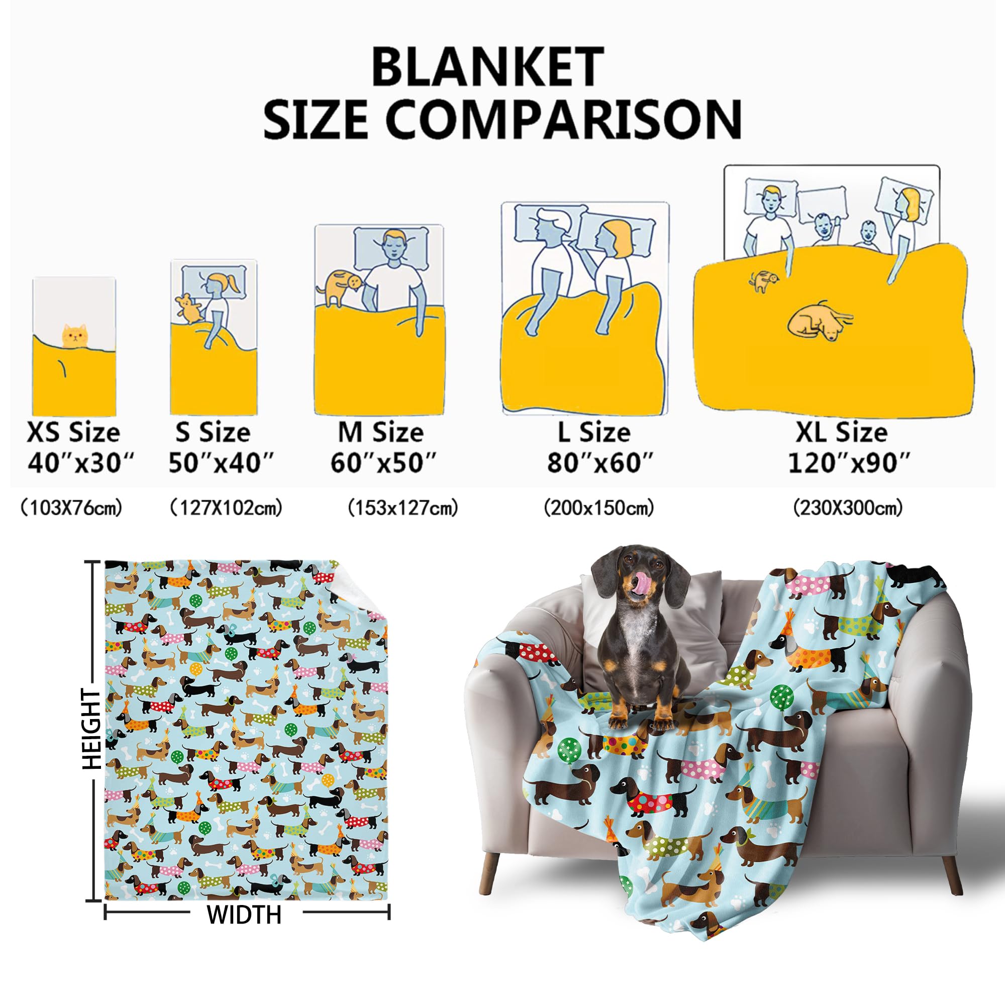 2. Las mantas de Dachshund vienen en cinco tamaños para que elijas. Sugerimos 30×40 para bebés o mascotas, 40×50 para niños, 50×60 para adultos y personas mayores, 60×80 y 90×123 para usar en la cama o con amigos y familiares. La manta de Dachshund tiene un patrón claro y bonito, que puede decorar nuestra cama, sofá o silla.