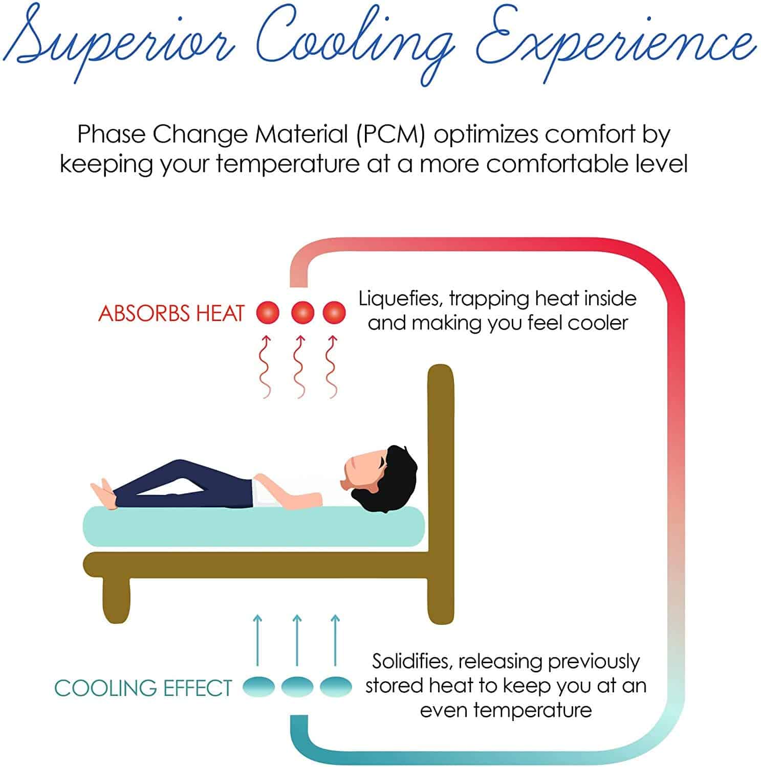 Diseñados para mantener seguros a los astronautas de las fluctuaciones de temperatura en el espacio, los Materiales de Cambio de Fase (PCM) son sustancias microencapsuladas que tienen la capacidad de cambiar de líquido a sólido a baja temperatura. A medida que el material de cambio de fase absorbe el calor de la superficie de tu cuerpo, se licúa, atrapando el calor en su interior haciéndote sentir más fresco. Cuando tu temperatura corporal baja, el material se solidifica y, al hacerlo, libera la energía térmica almacenada anteriormente, proporcionando un efecto cálido. Optimiza el confort manteniendo tu temperatura corporal en un nivel más cómodo para un sueño óptimo.