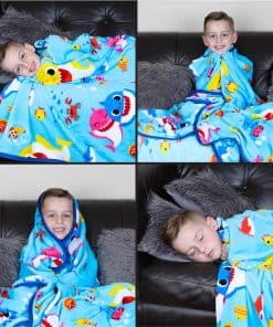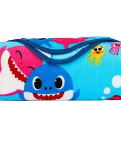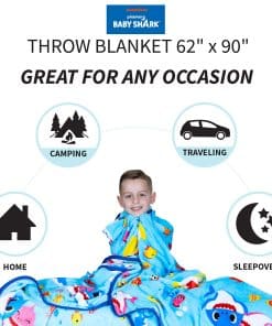Los divertidos e interactivos personajes de Baby Shark de Nickelodeon continúan ganando nuevos fanáticos todos los días. Ahora puedes llevar la diversión a casa con esta colorida y genial manta temática de «Nadando con tiburones».