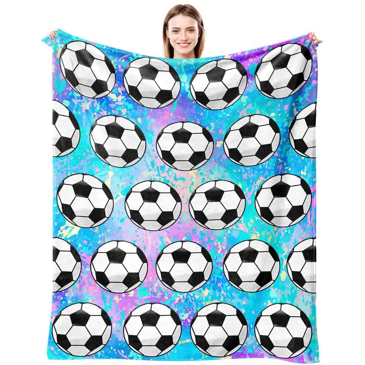 4. Versátil y práctica: Manta temática de merchandising de fútbol perfecta para acurrucarse en el sofá, leer un libro o disfrutar de eventos al aire libre. Cuando ella ve la televisión, lee un libro, en un sofá, en la cama o en noches frías, es un compañero perfecto, especialmente para viajes de campamento al aire libre, playa, conducción, viajes, vacaciones o mantenerlo dentro del auto para emergencias.