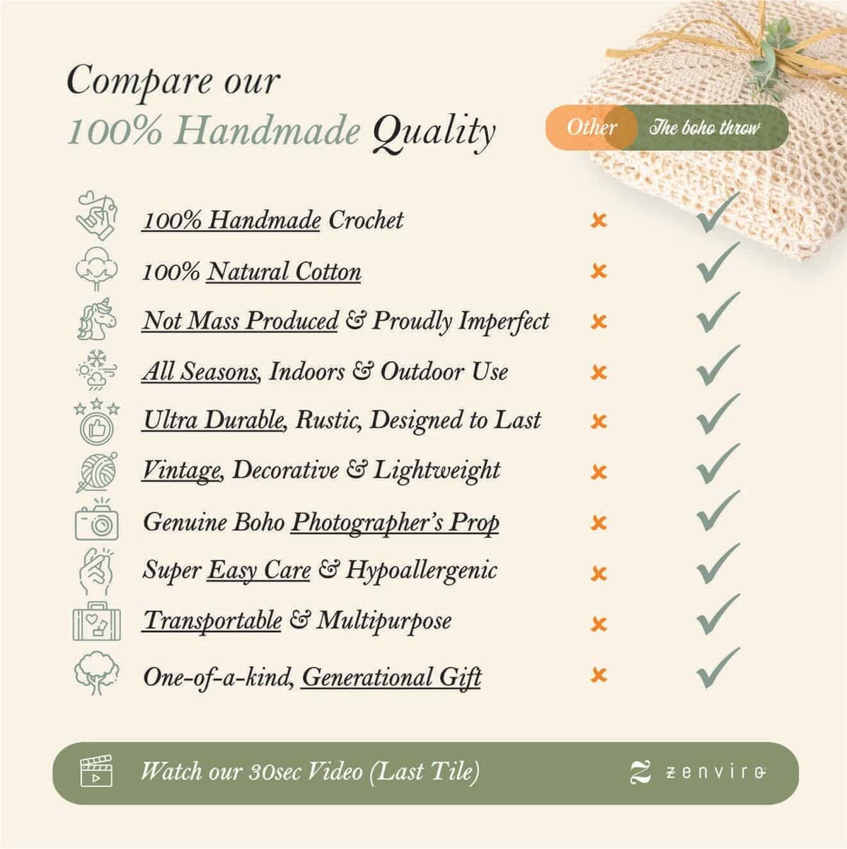 La Manta de Ganchillo Boho Original de Zenviro Como un homenaje moderno al espíritu de los años 60 y 70, nuestra manta de ganchillo con estilo boho entrelaza pasado y presente, capturando la esencia de los espíritus libres en todas partes. Cada Manta de Ganchillo Boho es 100% hecha a mano. A diferencia de otras, es duradera pero decorativa, ligera y vintage, y un regalo generacional hecho a mano. Disponible en colores natural, óxido, tierra y verde salvia. Diseño de Encaje Vintage Con cada nudo tejido en nuestra manta de ganchillo, hay un guiño al pasado. La elegancia vintage se une al estilo actual, infundiendo dulce nostalgia en la decoración de tu hogar. Tamaño La artesanía se une al encanto. Nuestra gran manta de ganchillo te abraza con su tamaño de aproximadamente 50″ x 60″ y un peso ligero de 1 libra. Un delicado acento para tu sofá, también está diseñado para viajar, acampar, parques, pícnics y playas. Un Regalo Hecho a Mano Único Diseñado para Durar una Generación Cada manta de ganchillo está hecha a mano por artistas profesionales de ganchillo. Los seres queridos en tu vida que valoran la calidad sobre la cantidad apreciarán este regalo pensado para mujeres y hombres durante años. Cómo Estilizarlo Colócalo sobre un sofá. Extiéndelo sobre tu cama. Envuélvelo alrededor de tus hombros. La Manta Boho es el compañero perfecto, infundiendo paz en cada espacio y en tu guardarropa personal. Ideal para Sesiones de Fotos ¡Nuestras mantas de ganchillo boho son el accesorio ideal para sesiones de fotos! Ya sea para hitos de bebés, reflexiones de adolescentes para capturas de último año, momentos íntimos de maternidad, embellecer una casa antes de una venta de bienes raíces o modelar como influencer de vida en furgoneta, esta manta agrega un atractivo delicado y llamativo. Fácil Cuidado Lavar a máquina en frío, detergente suave, no usar lejía, secar en línea y planchar ligeramente.