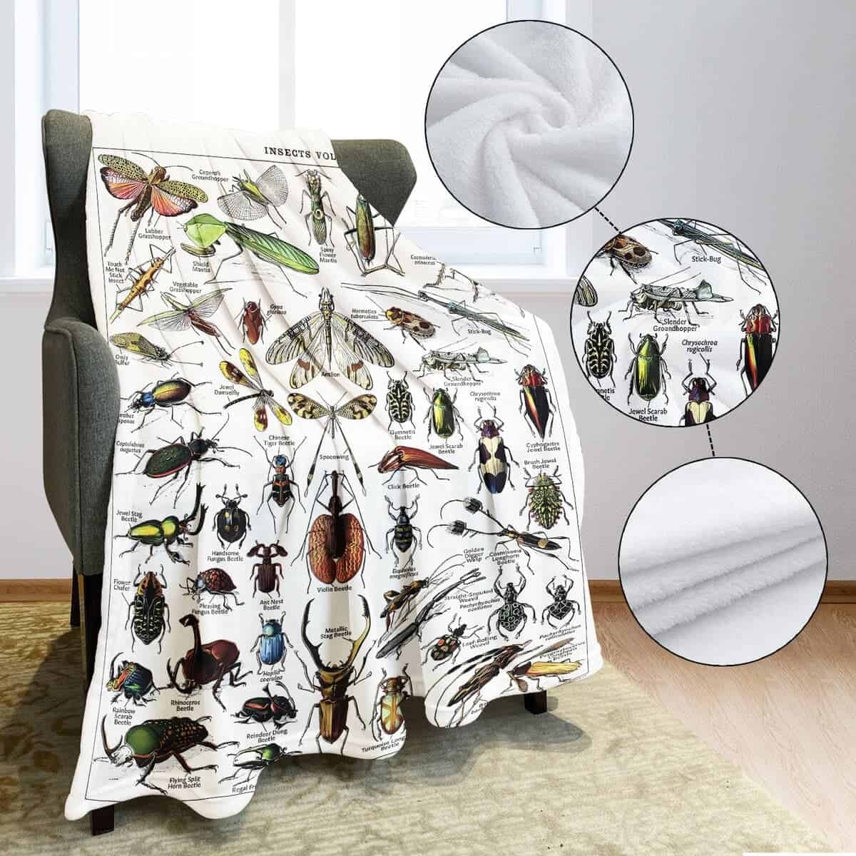 3. Característica: Nuestra manta de insectos tiene estampado un lado con patrones de insectos y el otro lado es blanco puro. Ambas caras de tela esponjosa te mantienen caliente y también te brindan una sensación diferente.