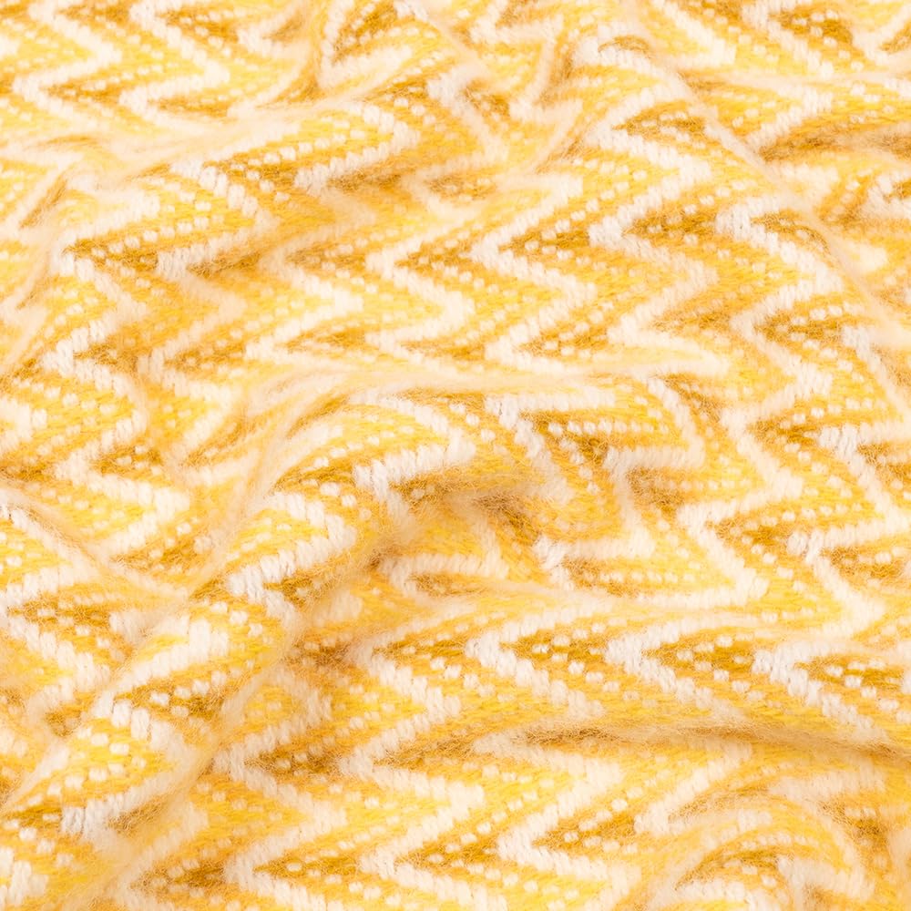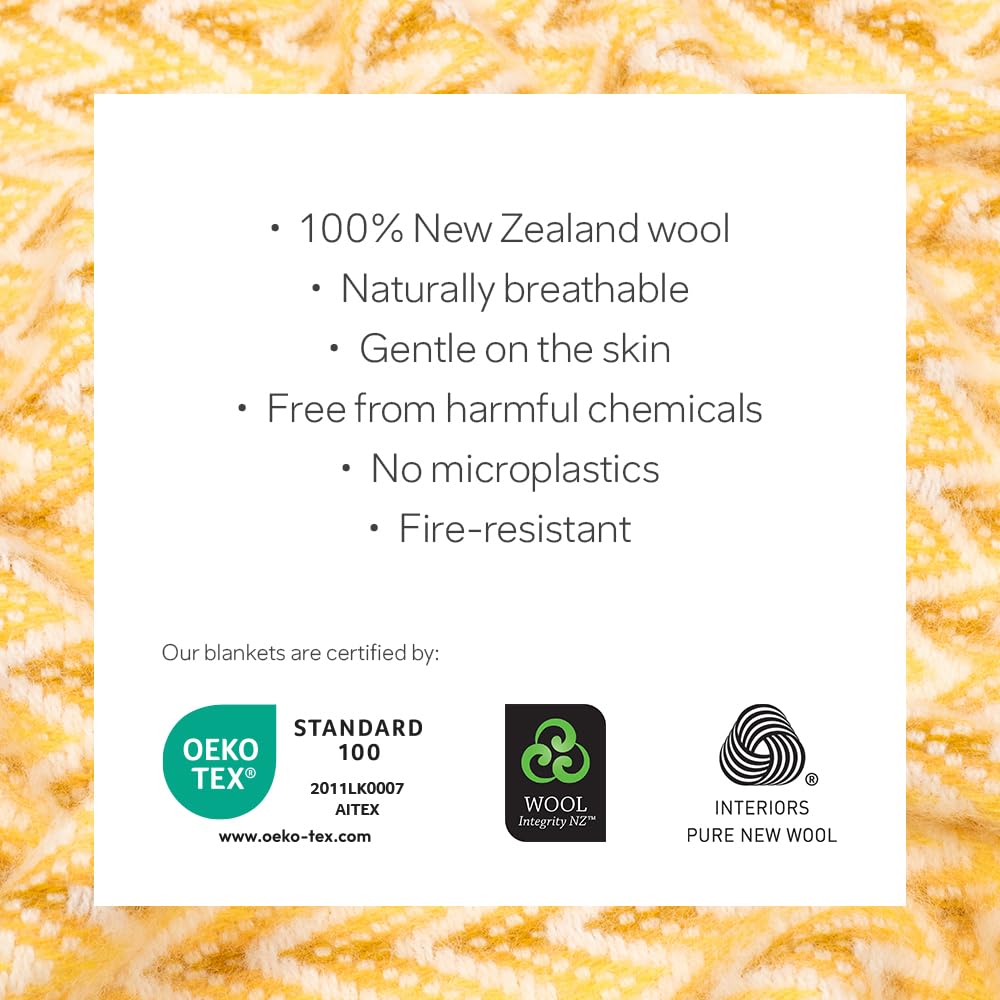 Manta de interiores Barker Textiles Shady Wave en un cálido color amarillo. Esta manta está fabricada con un 100% de lana de Nueva Zelanda, lo que la hace increíblemente suave y cálida. Perfecta para decorar tu hogar de una manera moderna y acogedora. La manta se ajusta a la temperatura de tu cuerpo para brindarte una sensación reconfortante. Además, está libre de sustancias químicas dañinas y microplásticos, lo que la convierte en una opción segura y ecológica. Añade un toque de calidez a tu hogar con esta maravillosa manta de alta calidad.