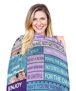 Probablemente esta ha sido el regalo de cumpleaños más exitoso que le has dado a alguien. La mejor manta de regalos de jubilación para mujeres es muy bien hecha y suave. Ha resistido la lavadora y secadora incluso y no luce apelmazada como la mayoría de las mantas de este tipo terminan haciendo. Tiene un bonito ribete alrededor de los bordes y un buen refuerzo de costuras, por lo que será duradera y durará mucho tiempo. Lo más especial de esta manta son todas las citas que tiene por toda la manta y cómo ninguna de ellas es cursi. Va directo al corazón y la recomiendo altamente para cualquiera a quien ames, incluyéndote a ti mismo.