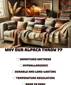 Envuélvete en el lujo incomparable de la Manta de Lana de Alpaca. Hábilmente fabricada en Perú, esta manta premium es una mezcla de 50% lana de alpaca, 35% lana y 15% acrílico, ofreciendo el equilibrio perfecto entre suavidad, calidez y durabilidad. Las fibras de alpaca proporcionan una excepcional aislamiento sin peso, haciéndola ideal para el confort durante todo el año. Ya sea colgada sobre un sofá, colocada en una cama o usada como envoltura acogedora en noches frías, esta manta versátil realza tu espacio vital con elegancia y estilo. Su diseño atemporal y materiales premium aseguran que se convierta en una pieza preciada en tu hogar durante años. Cuida tu manta lujosa adecuadamente con lavado en seco para preservar su suavidad y calidad. Vive la herencia de la artesanía peruana con la Manta de Lana de Alpaca – una combinación perfecta de tradición, lujo y funcionalidad.