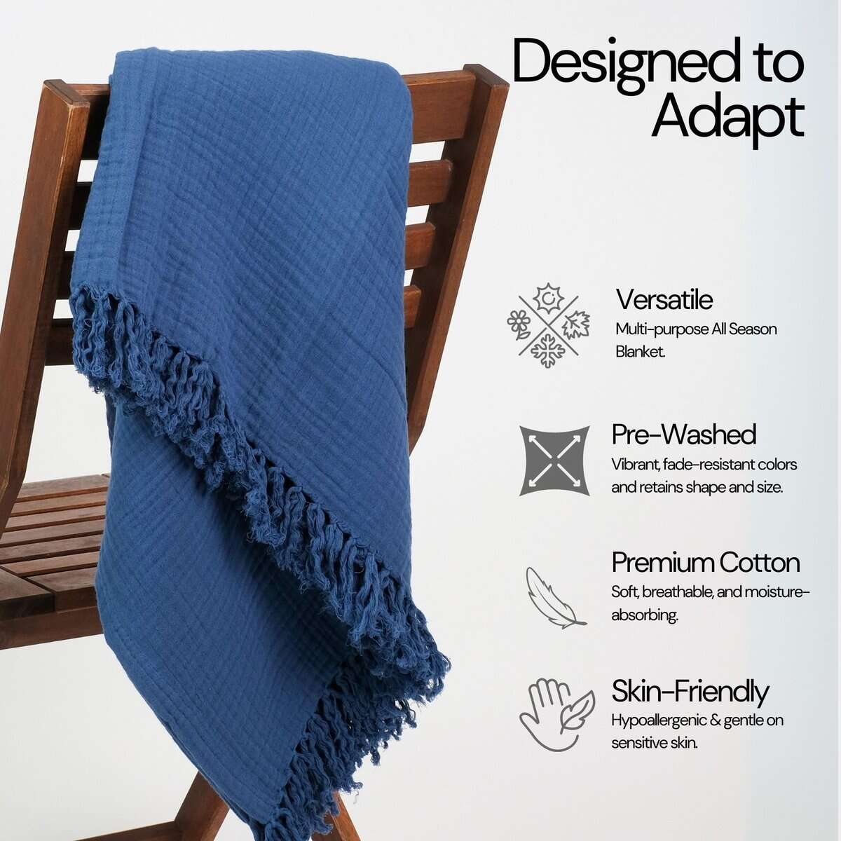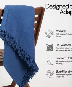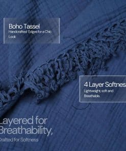 Manta de Muselina de Algodón 100%, Manta de Gasa de 50″X60″ con Borlas de 4 Capas para Sofá, Cama, Sala de Estar, Hogar, Mantas y Mantas Ligero y para Todas las Estaciones, Amigable con la Piel (Azul Marino) – Experimenta la versatilidad definitiva con nuestra manta de muselina de 4 capas, meticulosamente fabricada en tela de algodón 100% para una suavidad y calidez incomparables. Perfecta para sofás, camas queen o como manta de viaje, chal, mantas de picnic, decoración boho y más. Es una manta refrescante que agrega un atractivo acogedor, mientras que su diseño multiusos garantiza que sea un accesorio imprescindible para cada ocasión. Disfruta del lujo de nuestra manta de muselina de algodón 100% prelavado, asegurando colores vibrantes que no se desvanecen con el tiempo. Tejido con cuidado para una suavidad y transpirabilidad excepcionales, también es perfecta como manta para sofá, proporcionando comodidad amigable con la piel y ligera. Sus propiedades transpirables y absorbentes de la humedad promueven un sueño profundo y confortable, previniendo el sobrecalentamiento en las noches de verano, convirtiéndola en una elección ideal tanto para mantas de cama como para sofá. Personaliza tu experiencia de ropa de cama con nuestra versátil manta para cama, disponible en cinco colores relajantes blanco, azul, pergamino, espuma marina y gris para complementar cualquier decoración de dormitorio. Elige entre cuatro tamaños para garantizar el ajuste perfecto para tu cama, ya sea que estés buscando mantas de cama para una noche de sueño acogedora o específicamente buscando una manta de estilo boho que también ofrezca un confort y estilo óptimos. Eleva tu relajación con nuestra indulgente manta para cama, diseñada para brindar comodidad y estilo supremos. Ya sea que te acurruc