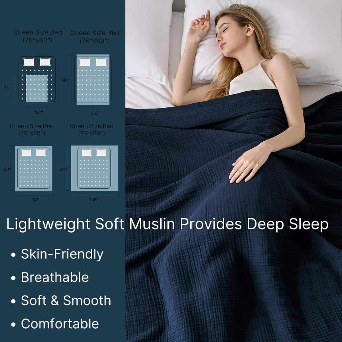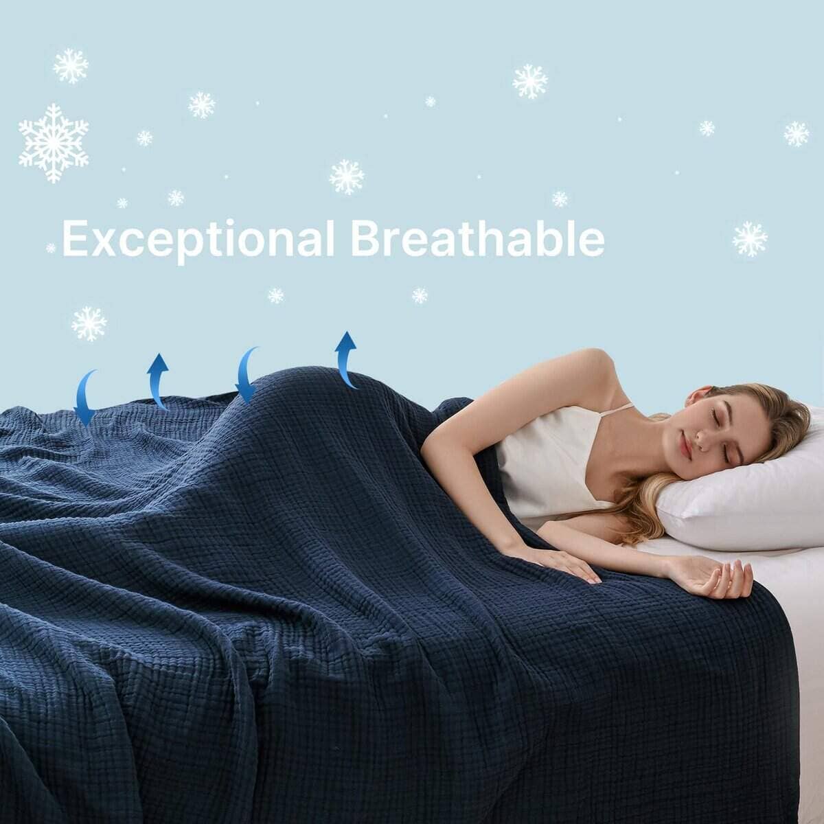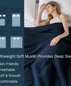 2. Transpirable y Absorción de Humedad: Diseñada para ofrecer máximo confort, nuestra manta de muselina destaca por su transpirabilidad y absorción de humedad, manteniéndote fresco y libre de sudor. La ligera muselina de algodon proporciona la cantidad justa de calidez sin sobrecalentar, convirtiéndola en la compañera perfecta para los que duermen con calor o las noches cálidas de verano.