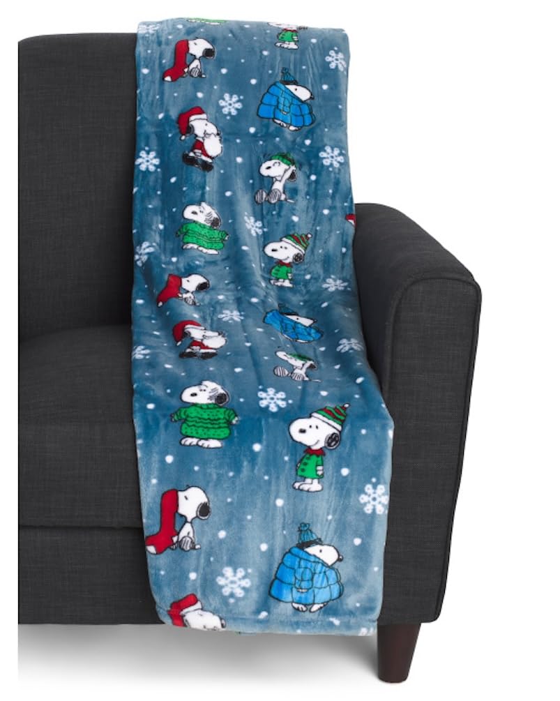 Manta de Navidad de la Pandilla de los Cacahuetes en color azul con diseño de Abrigo Acolchado y Suéter, tamaño de 50×70 pulgadas. Perfecta para mantenerte cálido y acogedor durante las festividades navideñas. Añade un toque encantador a tu decoración y muestra tu amor por los entrañables personajes de Snoopy, Charlie Brown y sus amigos.