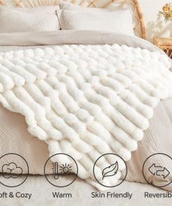 1. Doble cara suave y acogedora: Fabricada con piel sintética premium de imitación de conejo de 600GSM y tela aterciopelada ultra suave de 170GSM, la manta de piel falsa BEDELITE ofrece una calidez y comodidad incomparables en ambos lados. Acúrate con esta manta esponjosa durante el tiempo de descanso, disfruta de su suave y suave tacto para relajarte cuerpo y mente.