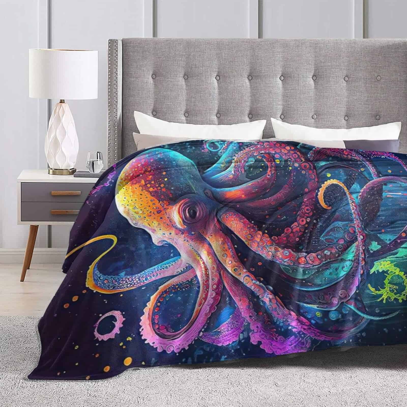 1. Manta de Amantes de Pulpo: La Manta de Regalos de Pulpo es un imprescindible para cualquier persona que ame a los pulpos, el diseño de la manta temática de pulpo es único y llamativo, lo que la convierte en una gran decoración para cualquier habitación, tan significativa y práctica.