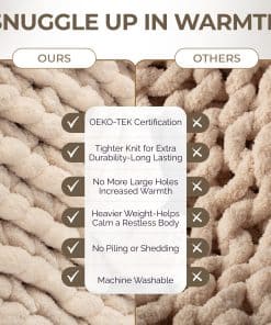 1. TEJIDO APRETADO-Nuestra manta de ganchillo cuenta con un tejido más apretado, asegurando máxima calidez y comodidad. Nuestra manta de gran nudo es ideal para aquellos que prefieren una manta ajustada y ponderada. El tejido más apretado de la manta gruesa tiene agujeros más pequeños y aumenta la durabilidad prolongando la vida de la manta anudada. La manta de lujo añade un atractivo estético definitivo a cualquier habitación mientras proporciona calidez como manta para sofá, mantas para cama, o manta decorativa. 2. PESO PESADO Y ULTRA-SUAVE Nuestra manta de punto ponderada es de 6 libras de confort seguro. Tendrás calidez durante todo el año con nuestra manta gruesa de punto de cable. Experimenta suavidad que brinda un abrazo reconfortante. Nuestra manta de 50×60 proporciona un éxtasis acogedor para todos. La suavidad y comodidad soñadoras proporcionadas por nuestra manta de punto grueso es esencial para noches de película, siestas, lectura de libros, estudio, tiempo en familia, reuniones de amigos, tiempo acurrucado, descanso, y relajación. 3. FÁCIL CUIDADO, HILOS ANTI-CADAS Y ANTI-PILLING: Diseñado con hilos de alta calidad, nuestra manta de punto grueso proporciona una experiencia limpia sin el lío de fibras que se desprenden. Nuestra manta de punto grueso es lavable a máquina. Es conveniente mantenerla limpia sin complicaciones. Su construcción duradera soporta lavados regulares, manteniendo su calidad y suavidad con el tiempo. Esta acogedora manta es perfecta para abrazar mascotas y niños sin preocupaciones debido a que nuestra manta se limpia fácilmente. 4. SUAVE EN LA PIEL – Nuestra manta de nudo está libre de sustancias y productos químicos dañinos, garantizando comodidad sin irritaciones incluso para las pieles más sensibles. La calidad de nuestra manta de lujo brinda tranquilidad mientras tú, tus niños, familia, amigos y tus mascotas se acurrucan con la manta suave y soñadora. Además de ser hipoalergénico, el hilo de alta calidad es más resistente y menos propenso a romperse con el uso y el desgaste con el tiempo. 5. REGALO PARA CUALQUIER OCASIÓN Nuestra manta de punto chenille hace un regalo memorable perfecto para cumpleaños, graduaciones, inauguración de vivienda, aniversarios, mejora pronto, Día de la Madre, Navidad, San Valentín, u ocasiones especiales. Cada manta de punto grueso será sellada al vacío a la llegada. Después de abrir la bolsa de polietileno, se revelará una manta suave envuelta en cinta y atada con un lazo. La manta de punto seguirá proporcionando tus pensamientos acogedores al receptor en el futuro.
