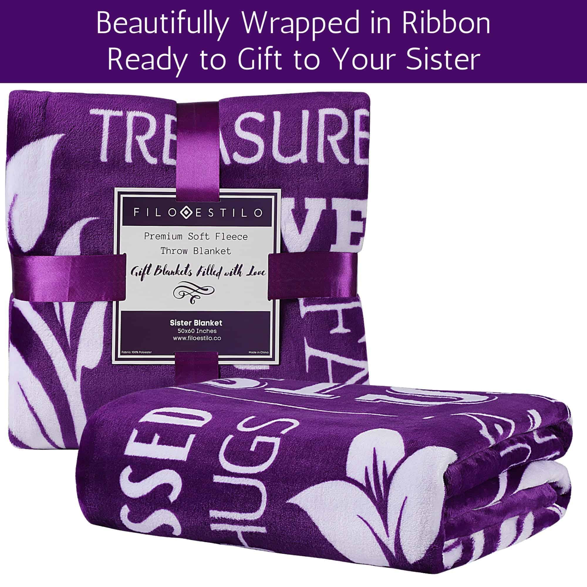 3. Día de las Hermanas Todo Envuelto: Las mantas suaves y acogedoras están atadas con una hermosa cinta coordinada, por lo que están listas para regalar a tu hermana en su cumpleaños, Navidad, San Valentín o simplemente para decir cuánto te importa cualquier día del año.