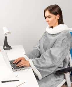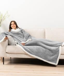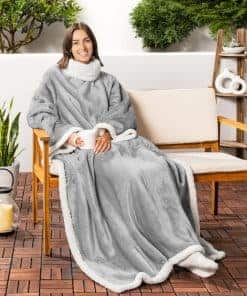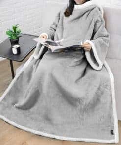 2. Manta de lana con mangas en microfibra premium: Hecha con 250 GSM de microfibra 100% premium y sherpa de lana, esta manta con mangas es súper suave y esponjosa y te mantiene cálido y acogedor durante toda la temporada. Nuestra manta envolvente tiene un gran abertura para las mangas y un bolsillo delantero tipo suéter para acurrucarse o descansar en tu sofá o sillón. La manta es lo suficientemente larga como para cubrir tus pies para una máxima calidez y comodidad.