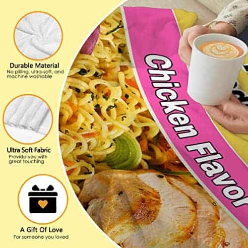 1. SÚPER CÁLIDA – La manta de sopa de fideos de ramen con sabor a pollo está hecha de franela de alta calidad. La manta de cama de franela te brinda una sensación ligera, cómoda, súper suave, cálida y agradable al tacto. Esta divertida manta de manta sopa de fideos hace un gran regalo para un amigo o miembro de la familia que ama el «Ramen Noodle».