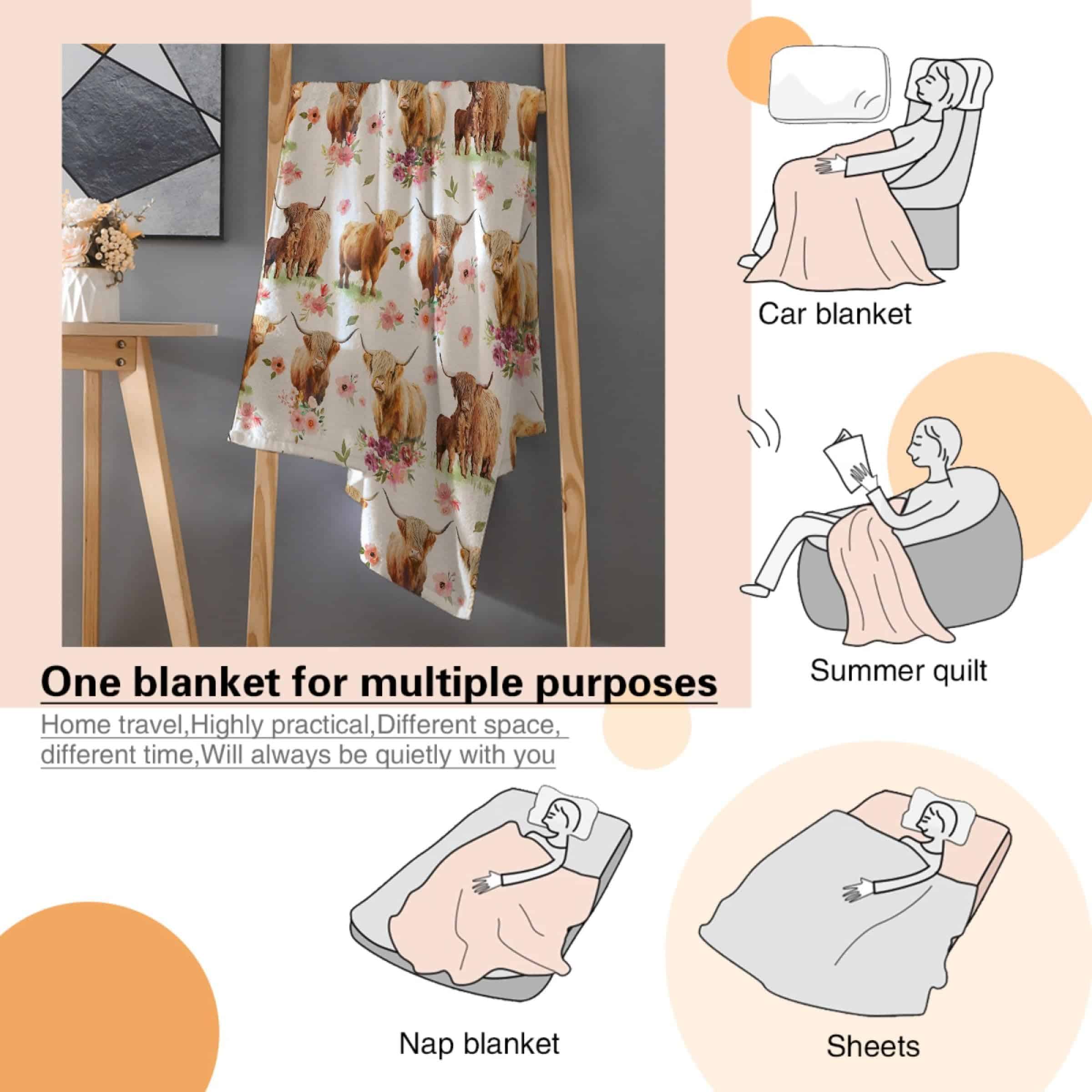 3. MÚLTIPLES APLICACIONES: La manta de Vaca de las Tierras Altas con un buen grado de suavidad, se puede doblar ocupando muy poco espacio, se puede utilizar como sábanas, fundas de sofá, adecuado para cualquier temporada. Ya sea en interiores o al aire libre, se puede utilizar en dormitorios, sofás, dormitorios, oficinas, automóviles, acampadas, picnics.
