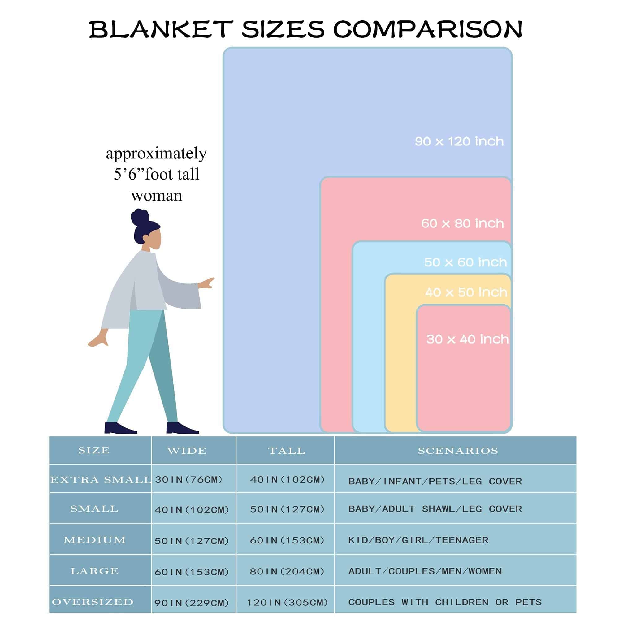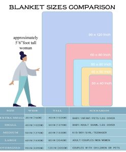 3. 5 tamaños de manta: 40″x30″ (tamaño extra pequeño) para mascotas, perros y gatos; 50″x40″ (tamaño pequeño) para niños, bebés, recién nacidos y niños pequeños; 60″x50″ (tamaño mediano) para adolescentes, viajes y siestas; 80″x60″ (tamaño grande) para adultos, enrollar y ver la televisión; 120″x90″ (tamaño extra grande) para toda la familia viendo la televisión y charlando con amigos. Es solo para referencia, elige el tamaño que necesites según tu situación actual.