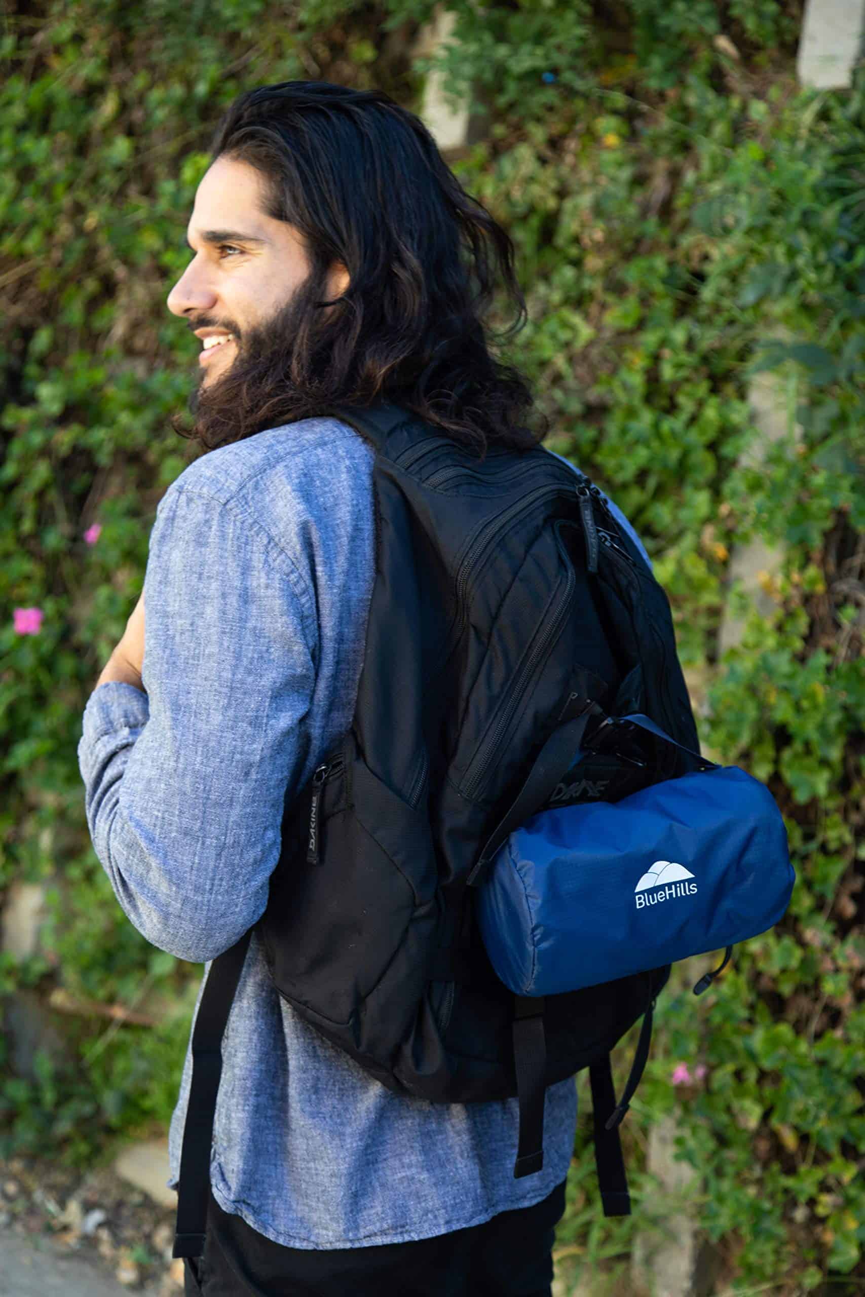 4. Muy ligero, menos de 1 libra con clip para mochila incluido en el paquete: Con el clip para mochila / mosquetón, puedes sujetar esta manta a cualquier mochila u otro equipaje, con la suave manta de viaje en color azul navy.