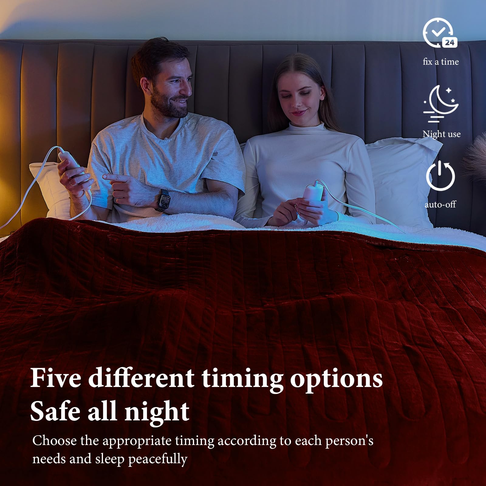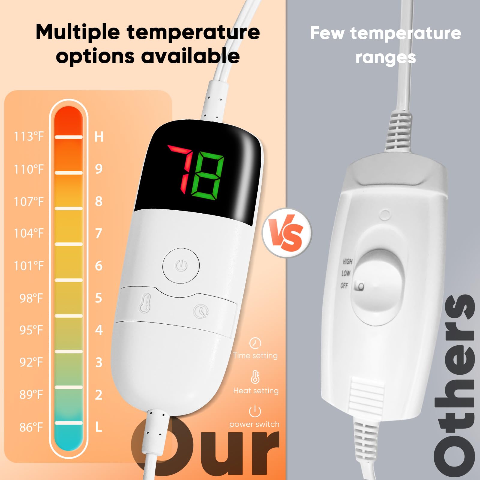 3. Actualización de ajustes de calefacción: En comparación con las típicas mantas eléctricas de 3 o 4 velocidades en el mercado, nuestras mantas calefactadas se han actualizado a 10 ajustes de calefacción (86 F – 131 F) con 5 ajustes de temporización (1,2,4,6,8 horas). Puede satisfacer el control de temperatura independiente de las dos zonas, y la pareja puede elegir la configuración de temperatura y el esquema de temporización que se adapte a sus necesidades.