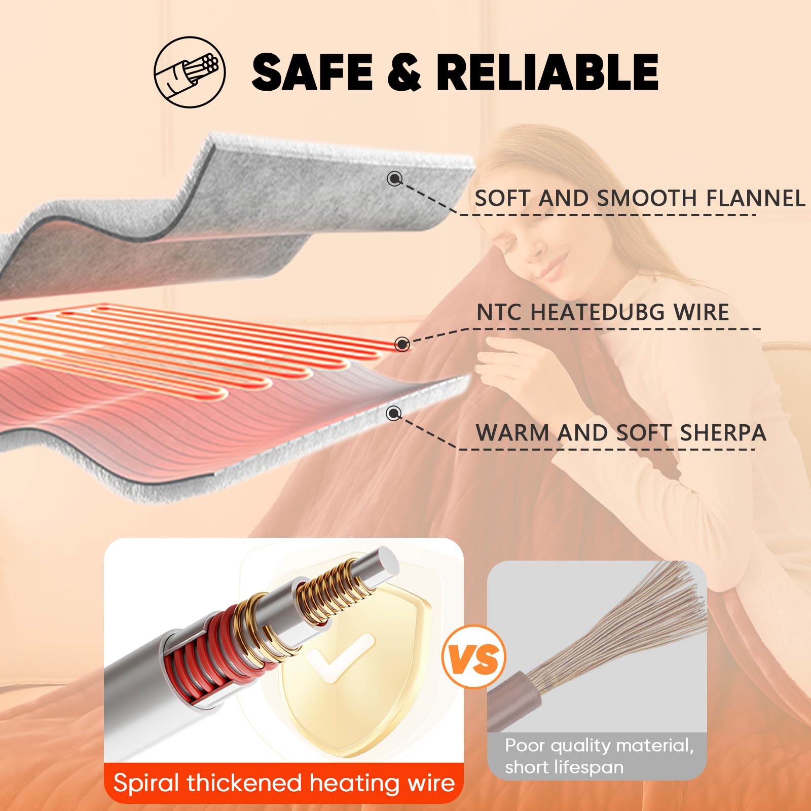 1. Seguro y confiable: La manta eléctrica tamaño King tiene la certificación de autoridad reconocida ETL y la certificación FCC, y cuenta con la función de protección contra sobrecalentamiento. Cuando estás ocupado con otras cosas y olvidas apagar la manta eléctrica calentada tamaño King o olvidas configurar el tiempo cuando duermes por la noche, la protección contra sobrecalentamiento activará automáticamente el apagado automático de la calefacción, evitando el peligro de incendio, para proteger la seguridad tuya y de tu familia.