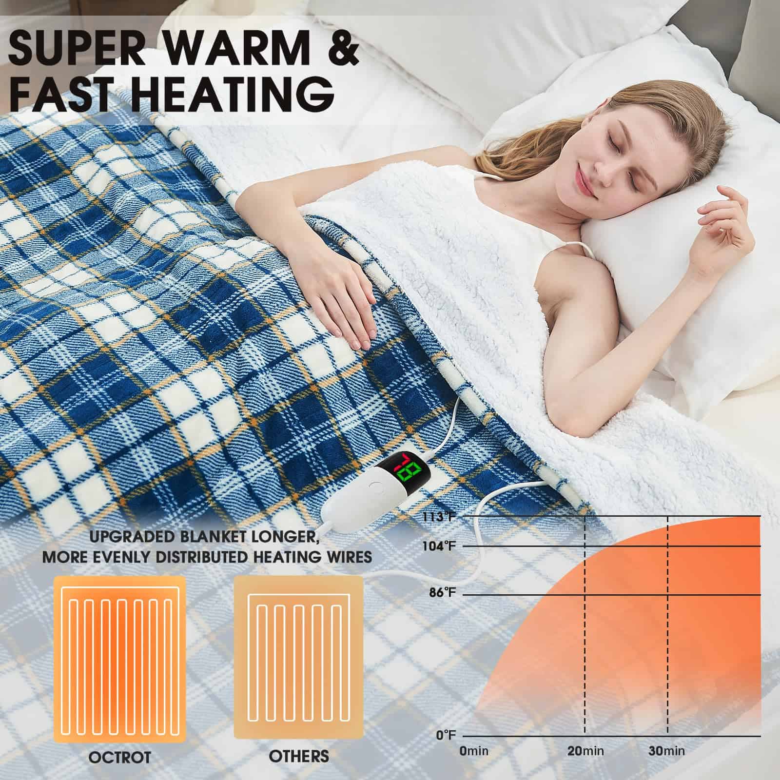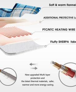 1. SEGURO Y CONFIABLE La manta calefactora tiene certificado ETL. Fijación de alambre calefactor y protección contra sobrecalentamiento para evitar que la manta se cortocircuite debido a dobleces y altas temperaturas. El control dual fabricado en material de pc puede soportar altas temperaturas y aumentar enormemente la velocidad de calentamiento de la manta eléctrica, mientras que el cable de alimentación de la manta Queen size tiene una longitud de hasta 2 metros, resolviendo el problema de la gran distancia entre el suministro de energía y su cama. 2. CÁLIDO PERO AHORRO DE ENERGÍA La manta calefactora tamaño queen está optimizada para una función de calentamiento rápido, lo que garantiza que su temperatura ideal se alcance en diez minutos en invierno frío. El cable calefactor más largo hace que el área de calentamiento alcance más del 85% al mismo tiempo que se calienta de manera uniforme. Los avances tecnológicos y los sistemas inteligentes de control de temperatura recuperan el exceso de calor a tiempo, ahorrándole muchos costos de calefacción en invierno. 3. CONTROL DE TEMPERATURA INTELIGENTE Y AJUSTES DE TEMPORIZADOR El diseño de un solo botón y la pantalla grande le ayudan a acostumbrarse rápidamente al controlador. Caliente hasta 113 F, y puede elegir entre 10 engranajes. Cada valor de temperatura de la manta eléctrica de forro polar ha pasado por decenas de miles de selecciones y estadísticas científicas para adaptarse a diferentes climas, escenas diferentes y necesidades de diferentes personas, para que pueda encontrar la calidez más cómoda en la cama. 4. USO MULTI-ESCENARIO Esta manta calefactora será el mejor regalo de invierno que hayas recibido. Nuestros diseñadores profesionales han elegido el color internacional del 2024 – Azul Marino y un patrón a cuadros, para crear un adorno elegante y el mejor regalo para ti. La manta de cuadros de tamaño completo encaja perfectamente con otras decoraciones del hogar y te brindará calor adicional este invierno. 5. PROBLEMAS POST-VENTA La manta calefactora se puede lavar a mano o en máquina. Asegúrese de separar el controlador de la manta Sherpa antes de limpiarla. Después de asegurarse de que la manta tamaño queen esté completamente seca, vuelva a conectar el controlador y úsela. Cuando el programa del controlador encuentre un problema, habrá indicaciones de F2, F5 para notificarle, no se preocupe, la sencilla operación en el manual de instrucciones resolverá su problema al 100%.