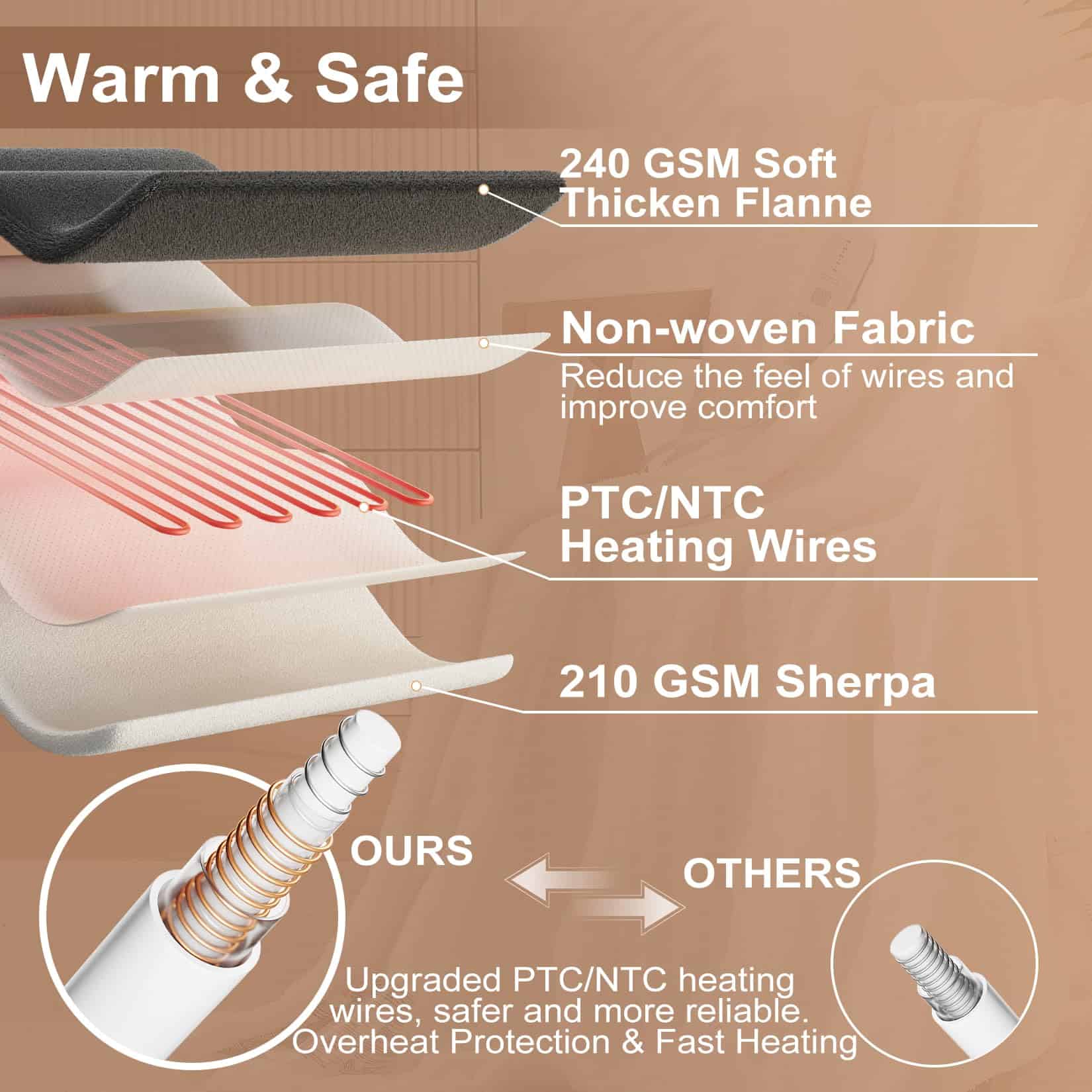 3. Seguridad y Confiabilidad Tu seguridad es nuestra principal prioridad. Descansa tranquilo con nuestra manta eléctrica con certificación ETL equipada con cables de calefacción inteligentes NTC&PTC. Estos cables monitorean y regulan continuamente la temperatura en tiempo real, garantizando una experiencia de calefacción segura y confiable mientras te relajas.