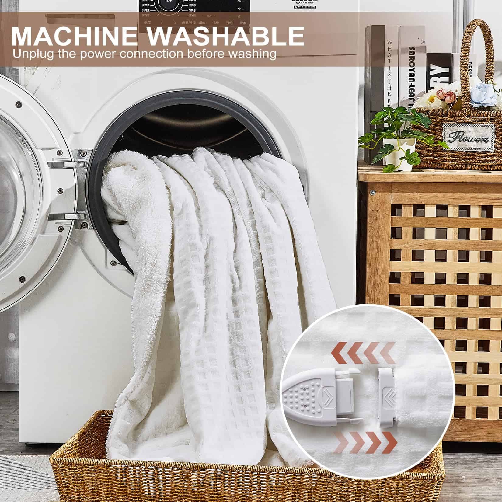5. Lavable a Máquina Mantener limpia tu manta eléctrica es sencillo. Simplemente retira el controlador de calefacción y lava la manta en frío en un ciclo suave. Después de lavar, estira suavemente la manta calefactora para que recupere su tamaño original y obtenga un rendimiento óptimo. Disfruta de la conveniencia de una manta cálida y fresca siempre que lo desees.