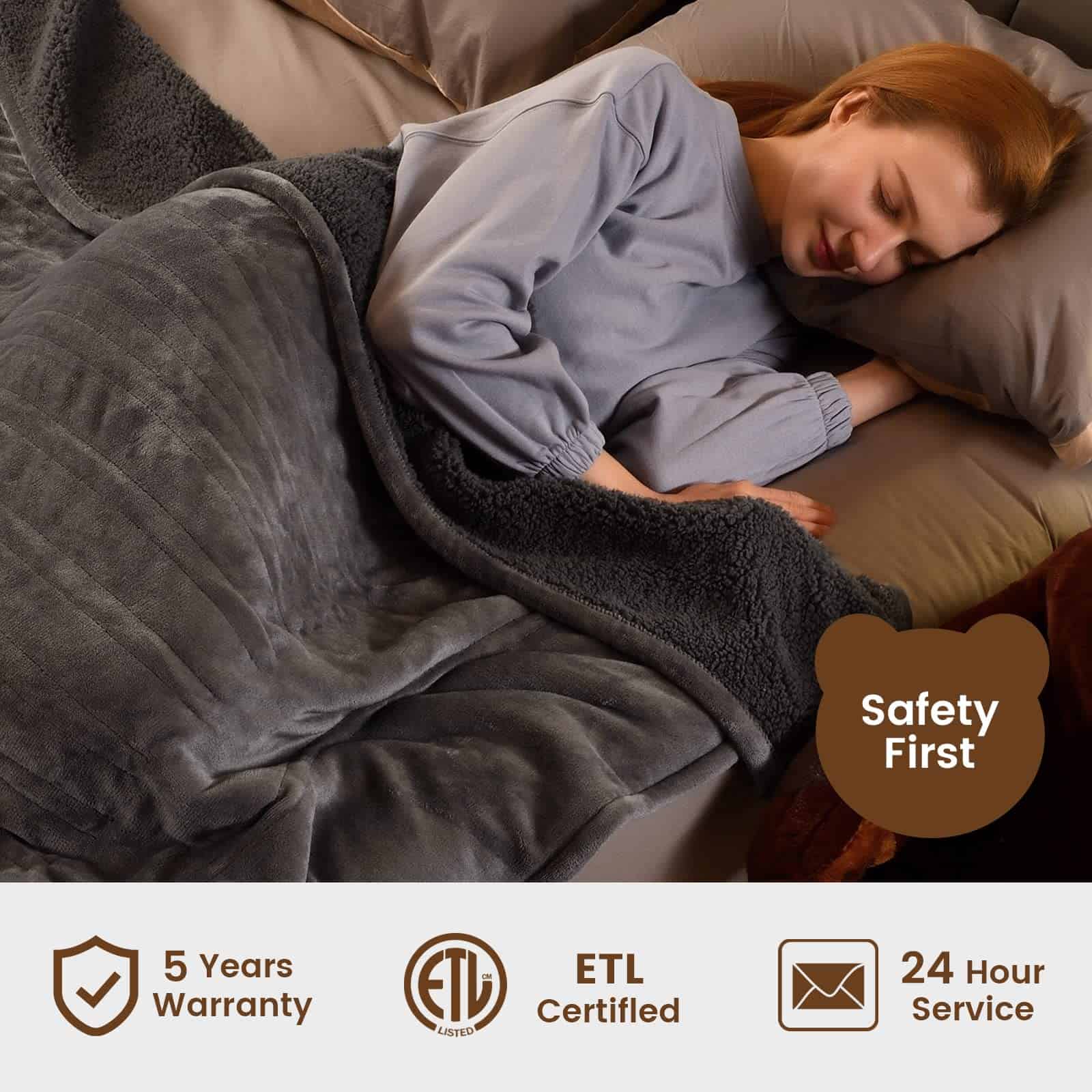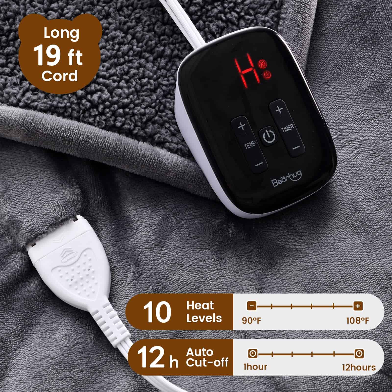 La manta está diseñada con dos zonas, cada una con un práctico controlador para calefacción y tiempo personalizados. Use el controlador para cambiar fácilmente entre 10 niveles de calor de 90 F a 108 F. Los cables calefactores están colocados de forma única para una distribución uniforme del calor que le ofrecerá calidez instantánea. La manta calefactora Bearhug se calienta con baja radiación. La protección contra sobrecalentamiento y el apagado automático de 1-12 horas garantizan seguridad y eficiencia energética. Nuestra manta eléctrica tamaño king está certificada por ETL. Varios tamaños y colores disponibles; Lavable a máquina y secadora disponibles; El cable extra largo ofrece máxima flexibilidad. Garantía de 5 años, devolución o intercambio de 30 días, garantía de respuesta 24 horas.