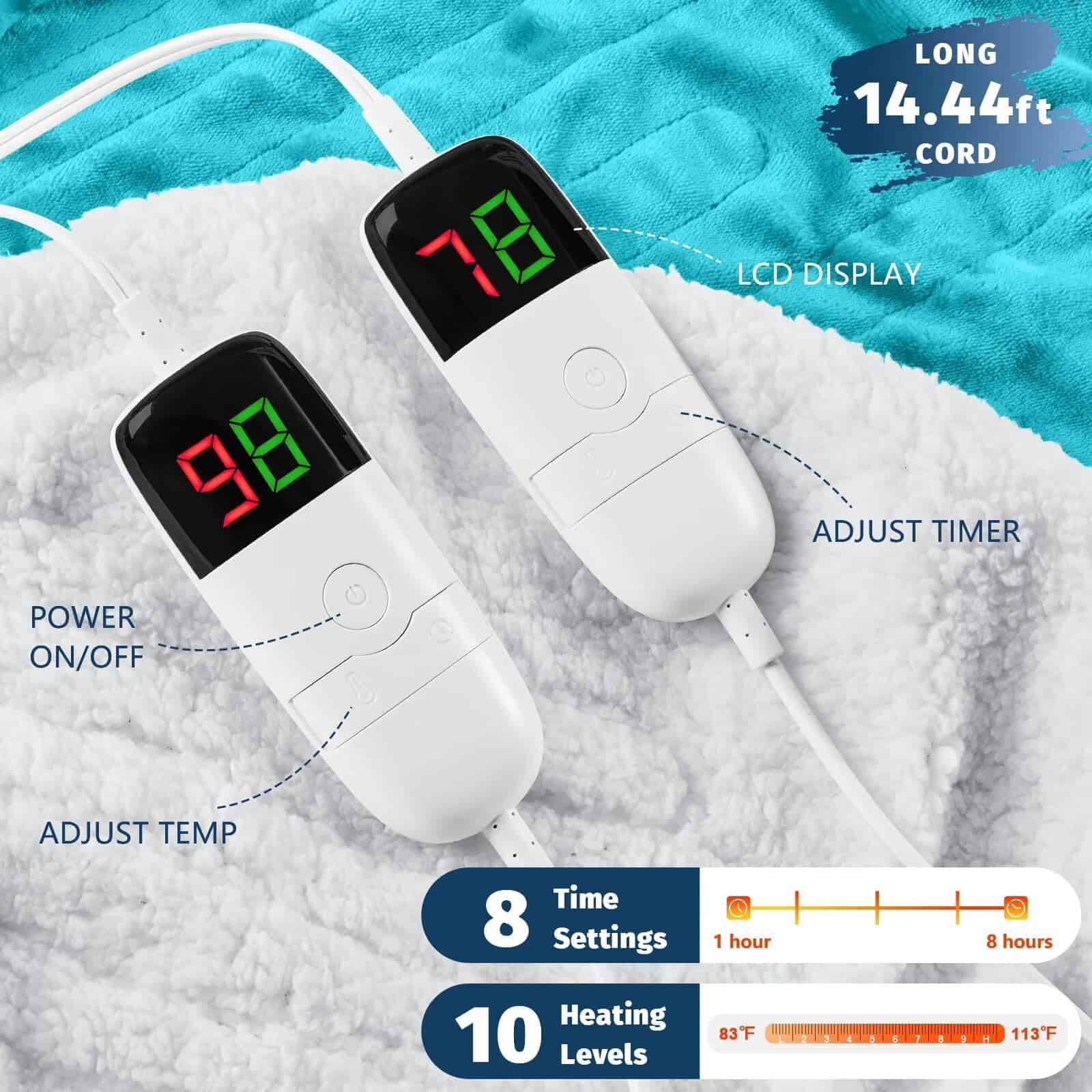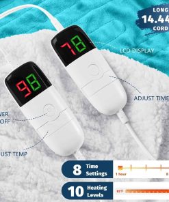 La manta eléctrica tamaño queen BOMOVA ha pasado la prueba UL y posee la certificación ETL & FCC, lo que significa más seguridad y menor radiación electromagnética al calentar la manta eléctrica queen size. Además, la protección contra sobrecalentamiento de la manta eléctrica queen size evita posibles riesgos, asegurando que puedas disfrutar del calor de forma cómoda y segura. Encuentra tu calidez perfecta con la manta calefactora con 10 niveles de calefacción diferentes (83 – 113 °F) utilizando los controladores LED, que puede mostrar la temperatura de forma intuitiva y personalizar el tiempo (1/2/4/6/8 horas). La manta eléctrica grande está diseñada con dos zonas, cada una con un controlador LED, resolviendo perfectamente los diferentes requisitos de calefacción y temporización de la manta eléctrica para adultos. Con función de apagado automático, puedes controlar la manta eléctrica queen para que se apague automáticamente a las 1/2/4/6/8 horas a través del controlador. Si olvidas configurarlo, no te preocupes demasiado. La manta cálida para invierno está diseñada con funciones de seguridad integradas y se apagará automáticamente después de 8 horas de uso. La manta eléctrica queen con un cable de alimentación de 14.44 pies te da más espacio para moverte, sin preocuparte por la distancia entre el enchufe y las mantas de invierno tamaño queen. La manta queen calefactable es adecuada para uso en pareja, viendo televisión, leyendo libros, relajándose en casa en el sofá o sofá; durante el trabajo en la oficina, te brinda una experiencia de vida cálida y cómoda. Recibir regalos es divertido, encontrar un regalo para hombres, ehhh. no tanto. ¿Qué podría superar a una manta térmica utilizada para cada sueño como regalos para mujeres, mamá, hombres, parejas? Si estás buscando un regalo para una casa nueva, recuperación de cirugía, o como regalos de elefante blanco para adultos, simplemente dando una manta cálida y suave y esperando su expresión de sorpresa. La limpieza y el cuidado de la manta eléctrica queen dual control es súper conveniente. Antes de limpiar, saca el controlador y déjalo enfriar. Usa agua fría o tibia en un ciclo de agitación lento. Luego seca a fuego lento o al aire.