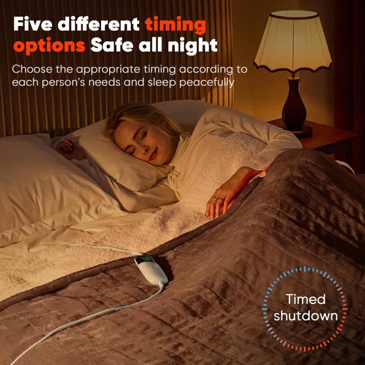 3. Actualización de los ajustes de calor: En comparación con las típicas mantas eléctricas de 3 o 4 velocidades en el mercado, nuestras mantas calefactoras se han mejorado a 10 ajustes de calor (86 ° F – 131 ° F) con 5 ajustes de tiempo (1,2,4,6,8 horas). Sin importar la edad, sin importar la ocasión, puedes elegir el ajuste de temperatura y el esquema de tiempo que se adapte a tus necesidades, esta es una manta calefactora muy adecuada para niños y adultos.