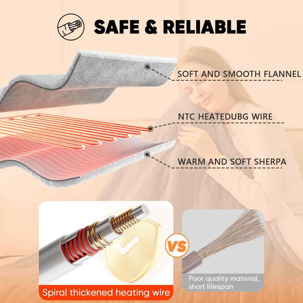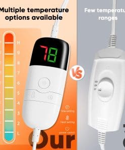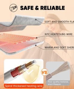 La manta eléctrica full size cuenta con certificación de autoridad ETL y certificación FCC, y tiene la función de protección contra sobrecalentamiento. Cuando estás ocupado con otras cosas y olvidas apagar la manta eléctrica de tamaño completo o olvidas programar el tiempo cuando duermes por la noche, la protección contra sobrecalentamiento activará automáticamente el apagado automático del calentamiento, previniendo el peligro de incendio y protegiendo la seguridad tuya y de tu familia. Comparada con el aire acondicionado o la calefacción por suelo radiante, la manta calefactable de greenoak es más eficiente en energía y puede ahorrar más costos de calefacción en invierno; Comparada con las mantas calefactables inalámbricas con puerto USB, con batería recargable, o almohadillas para colchón calefactables, es más segura y no requiere reemplazar la batería; Un área de calentamiento más grande proporciona de 3 a 5 veces más calor que una pequeña manta calefactable de regazo. Atrás quedaron las típicas mantas eléctricas de 3 o 4 velocidades en el mercado, nuestras mantas calefactables se han actualizado a 10 configuraciones de calor (86 F – 131 F) con 5 ajustes de tiempo (1, 2, 4, 6, 8 horas). Sin importar la edad ni la ocasión, puedes elegir la configuración de temperatura y programación que se adapte a tus necesidades, siendo una manta calefactable muy adecuada para niños y adultos. Puede ser colgada, cubierta, con cable extendido para satisfacer el uso en habitaciones, sofás, sillas, sala de estar, oficina, y otros ambientes; En comparación con las típicas mantas eléctricas de cuadros o estampadas, esta manta eléctrica está disponible en una variedad de colores de moda para adaptarse a todos los estilos de decoración, para chicas, chicos, puedes elegir un color favorito, simple y elegante, nunca falla. Algunos consejos: Esta manta eléctrica de franela térmica gruesa es apta para lavado a mano y a máquina, pero evita usar la secadora, para evitar el derretimiento de los cables de calentamiento de alta temperatura, lo cual resultaría en pérdidas; En el proceso de uso, evita apilar demasiado las mantas calefactables juntas durante mucho tiempo para prevenir que la temperatura local sea demasiado alta, lo cual podría ser perjudicial para el cuerpo, un uso científico para un invierno cálido y sin frío.