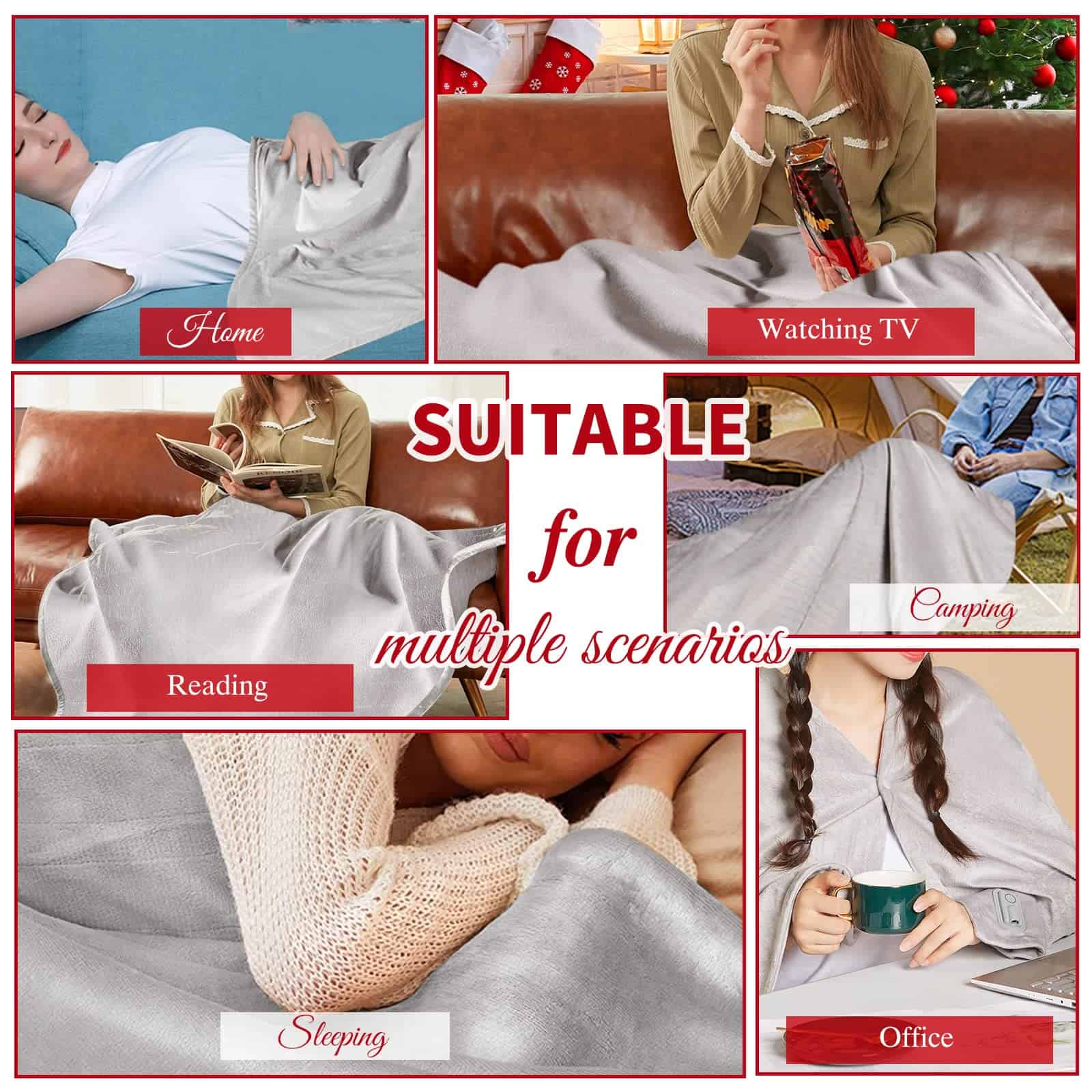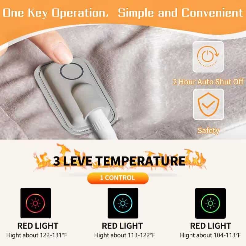 1.Calidez lujosa: Experimenta la comodidad de nuestra manta eléctrica de felpa, diseñada para ofrecer el máximo confort con una manta suave que te mantiene caliente en cualquier entorno. 2.Control de temperatura ajustable: Equipada con una función de ajuste de temperatura de 3 modos, que te permite personalizar tu nivel de calor para un confort personalizado. 3.Calidez portátil: El diseño portátil hace de esta manta eléctrica el compañero perfecto tanto para uso en casa como en la oficina, brindando calor instantáneo donde lo necesites. 4.Primero la seguridad: Disfruta de la tranquilidad con nuestras funciones de seguridad, que incluyen protección contra sobrecalentamiento y una función de apagado automático para un uso seguro y duradero. 5.Versatilidad de tamaño completo: Esta manta de tamaño completo ofrece un uso versátil en diversas situaciones, desde acurrucarse en el sofá hasta una noche cálida de sueño, garantizando un calor constante en todo momento.