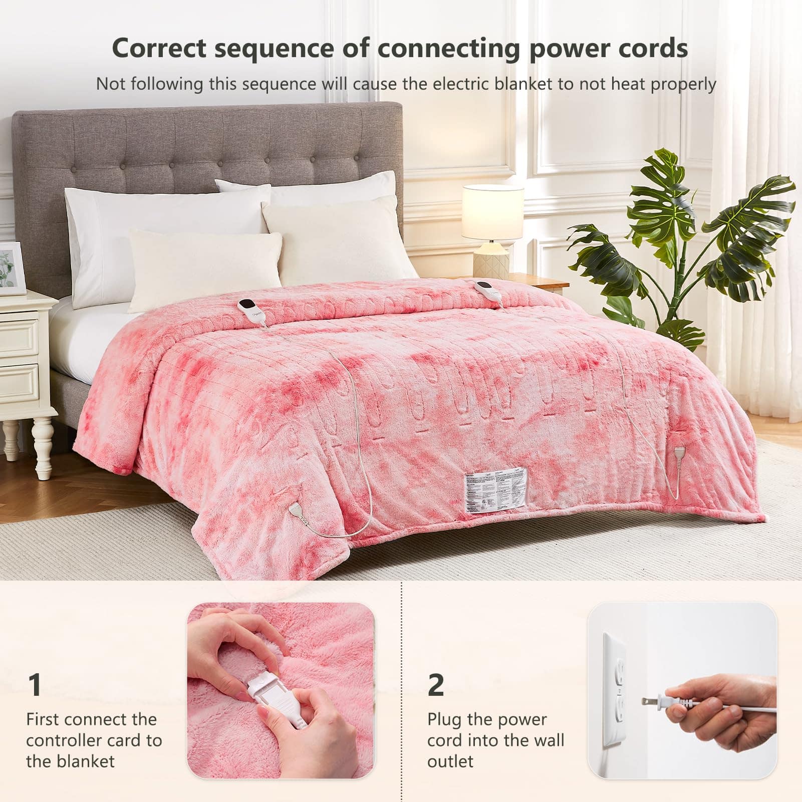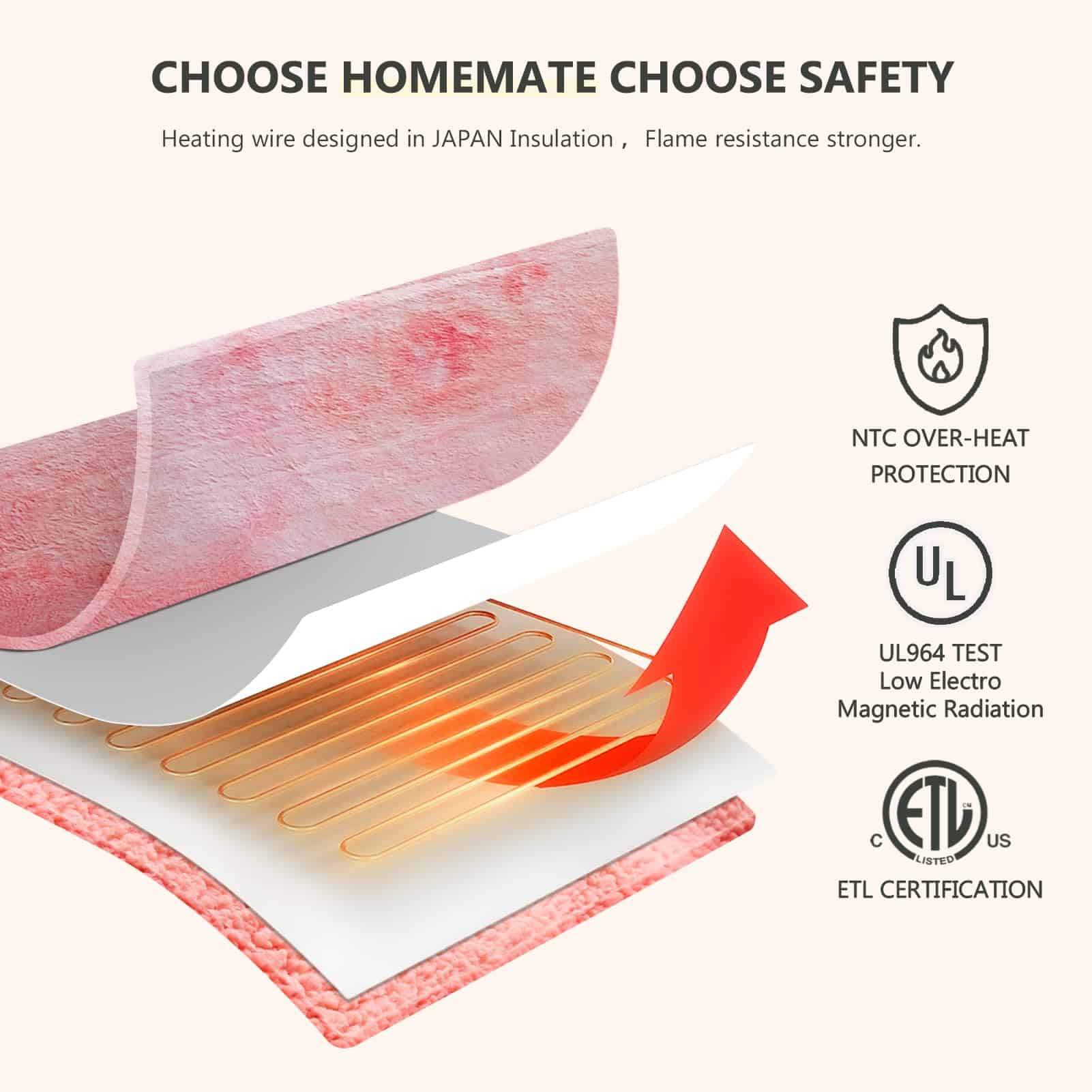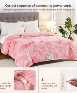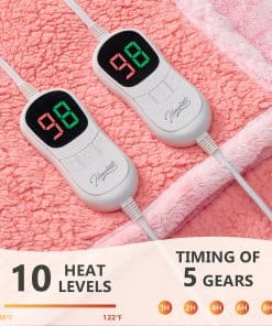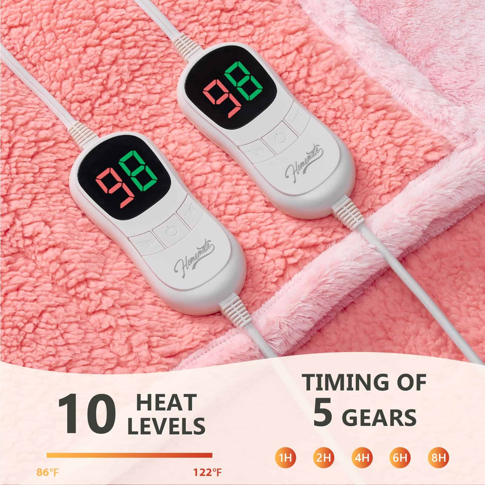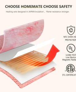 Manta térmica Homemate para cama Queen con alto nivel de confort y seguridad. Fabricada con material premium de 380gsm piel sintética + 220gsm sherpa, esta manta es suave, cálida y duradera. La tecnología de calefacción japonesa garantiza un calentamiento uniforme y un bajo nivel de radiación electromagnética. Equipada con protección contra sobrecalentamiento y ajuste automático de temperatura, esta manta es eficiente energéticamente y segura de usar. Con 10 niveles de calor, apagado automático y un cable de alimentación de 16.7 pies, es fácil de usar en cualquier lugar. Perfecta como regalo de cumpleaños o para las fiestas. Lavable a máquina para un fácil mantenimiento.
