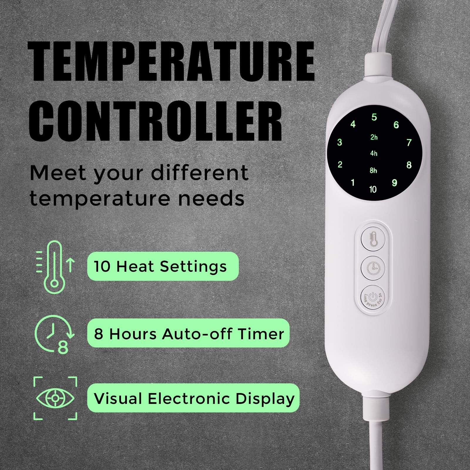 1. Rápido Calentamiento y Fácil Operación: Esta manta eléctrica tamaño queen cuenta con un controlador digital para ajustes fáciles de temperatura con solo un botón. Disfruta de un calentamiento rápido con 10 niveles de calor y un temporizador de 2/4/8 horas. El rango de temperatura de 77 F a 131 F proporciona calor personalizado para ayudar a relajar tu cuerpo y aliviar la fatiga.