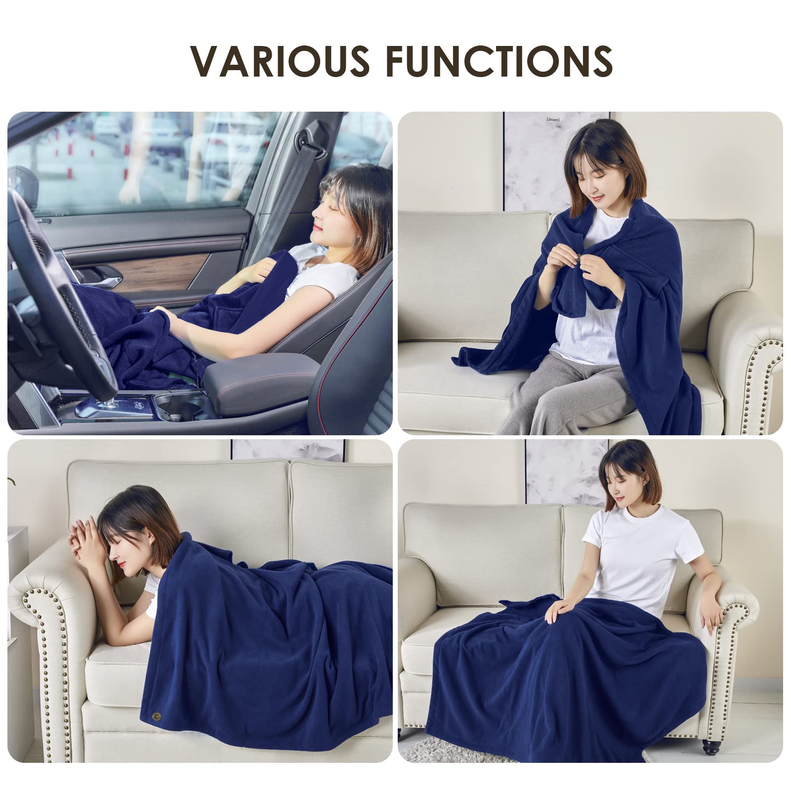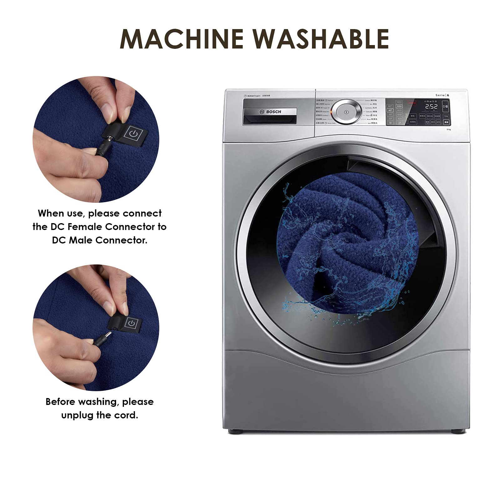 3. Incluye Dos Adaptadores: La manta térmica incluye un adaptador de corriente para el hogar y un adaptador de cigarrillo para viajes en coche. Conecte el adaptador de corriente para el hogar a un enchufe cuando lo use en interiores. Y use el adaptador de cigarrillo cuando viaje en coche.