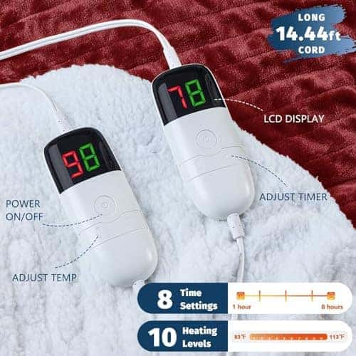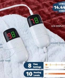 10 NIVELES DE CALENTAMIENTO: Encuentra tu calor perfecto con la manta calefactora de 10 diferentes niveles de calefacción (83 – 113 ) utilizando los controladores LED, que pueden mostrar la temperatura de manera intuitiva y personalizar el tiempo (1/2/4/6/8 ). La manta eléctrica tamaño king está diseñada con dos zonas, cada una con un controlador LED, resolviendo perfectamente los diferentes requisitos de calefacción y temporización de la manta eléctrica.