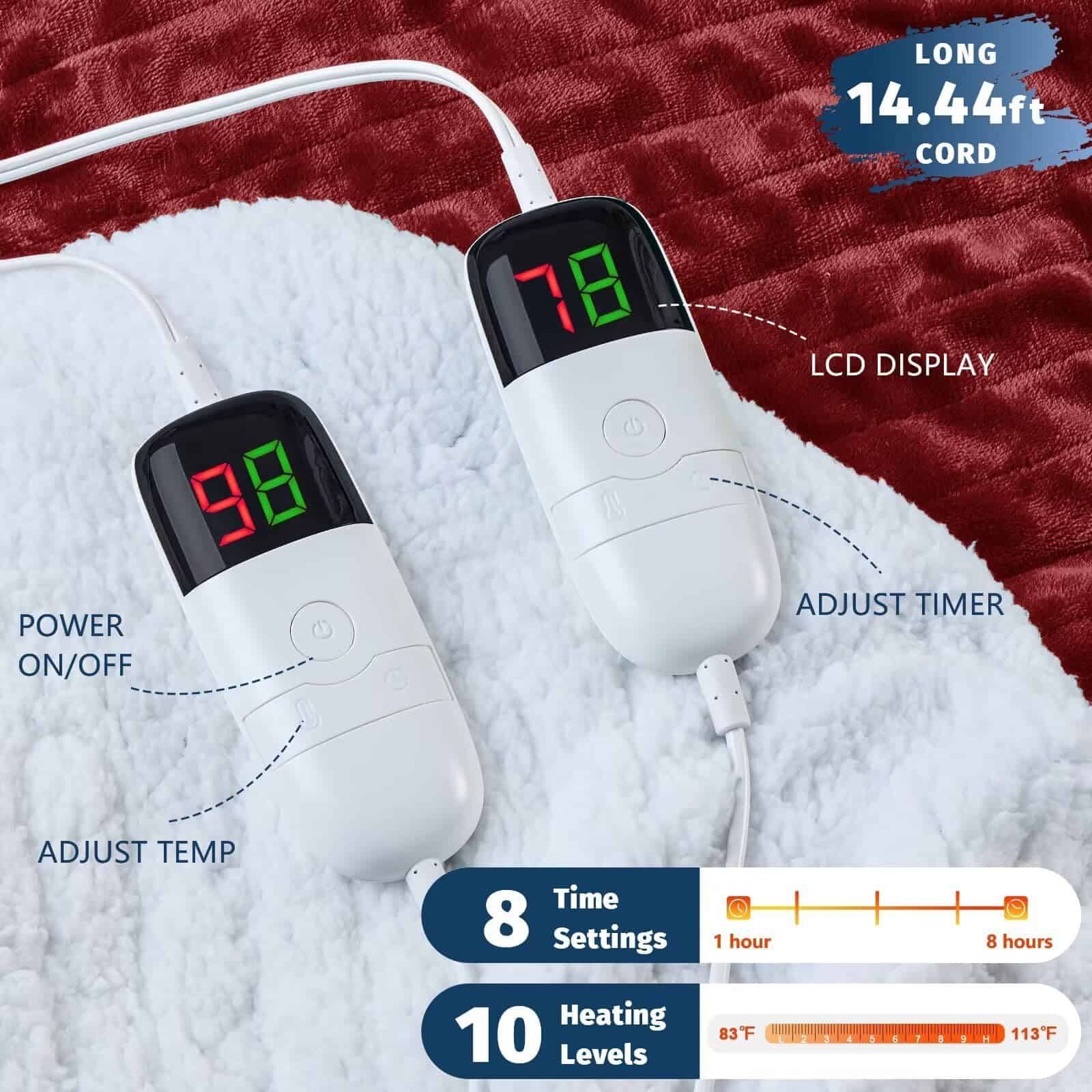 1. CERTIFICADA ETL & FCC: La manta calefactora de BOMOVA ha pasado la prueba UL y tiene la certificación ETL & FCC, lo que significa más seguridad y menor radiación electromagnética al calentarla. Además, la protección contra sobrecalentamiento de la manta calefactora previene posibles riesgos, asegurando que puedas disfrutar del calor de manera cómoda y segura. 2. 10 NIVELES DE CALOR: Encuentra tu nivel perfecto de calor con 10 diferentes niveles de calentamiento (83 -113) utilizando los controles LED, que pueden mostrar de manera intuitiva la temperatura y personalizar el tiempo (1/2/4/6/8). La manta calefactora grande está diseñada con dos zonas, cada una con un controlador LED, solucionando perfectamente los diferentes requisitos de calentamiento y temporización de la manta eléctrica para adultos. 3. APAGADO AUTOMÁTICO SEGURO: Con función de apagado automático, puedes controlar la manta eléctrica queen para que se apague automáticamente a las 1/2/4/6/8 horas a través del controlador. Si olvidas configurarlo, no te preocupes demasiado. La manta térmica está diseñada con características de seguridad integradas y se apagará automáticamente después de 8 horas de uso. 4. FLEXIBILIDAD Y COMODIDAD: La manta calefactora queen con cable de 14.44 pies te da más libertad de movimiento, sin preocuparte por la distancia entre el enchufe y las mantas de invierno para tamaño queen. La manta queen calefactora es adecuada para el uso de parejas, viendo televisión, leyendo libros, relajándote en casa en el sofá; durante el trabajo en la oficina, te brinda una experiencia de vida cálida y cómoda. 5. GRAN REGALO: Recibir regalos es divertido, pero encontrar regalos para hombres, ufff, no tanto. ¿Qué podría superar a una manta térmica utilizada para cada sueño como regalo para mujeres, mamá, hombres, parejas? Si estás buscando un regalo para la mudanza, recuperación de una cirugía, o como regalos de elefante blanco para adultos, simplemente entregando una suave manta calefactora y esperando su sorprendida expresión.