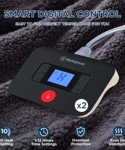 Manta eléctrica Westinghouse tamaño queen de color gris oscuro. Doble capa de 200GSM de borreguito suave y acogedora, ideal para usar en sofás, camas o para relajarse viendo la televisión, leyendo un libro o aliviar los músculos doloridos. Control de 10 niveles de calor para personalizar la comodidad y apagado automático de 1 a 12 horas para mayor conveniencia y seguridad. Con certificación de seguridad ETL y protección contra sobrecalentamiento. Lavable a máquina en ciclo delicado. Garantía de satisfacción de Westinghouse.