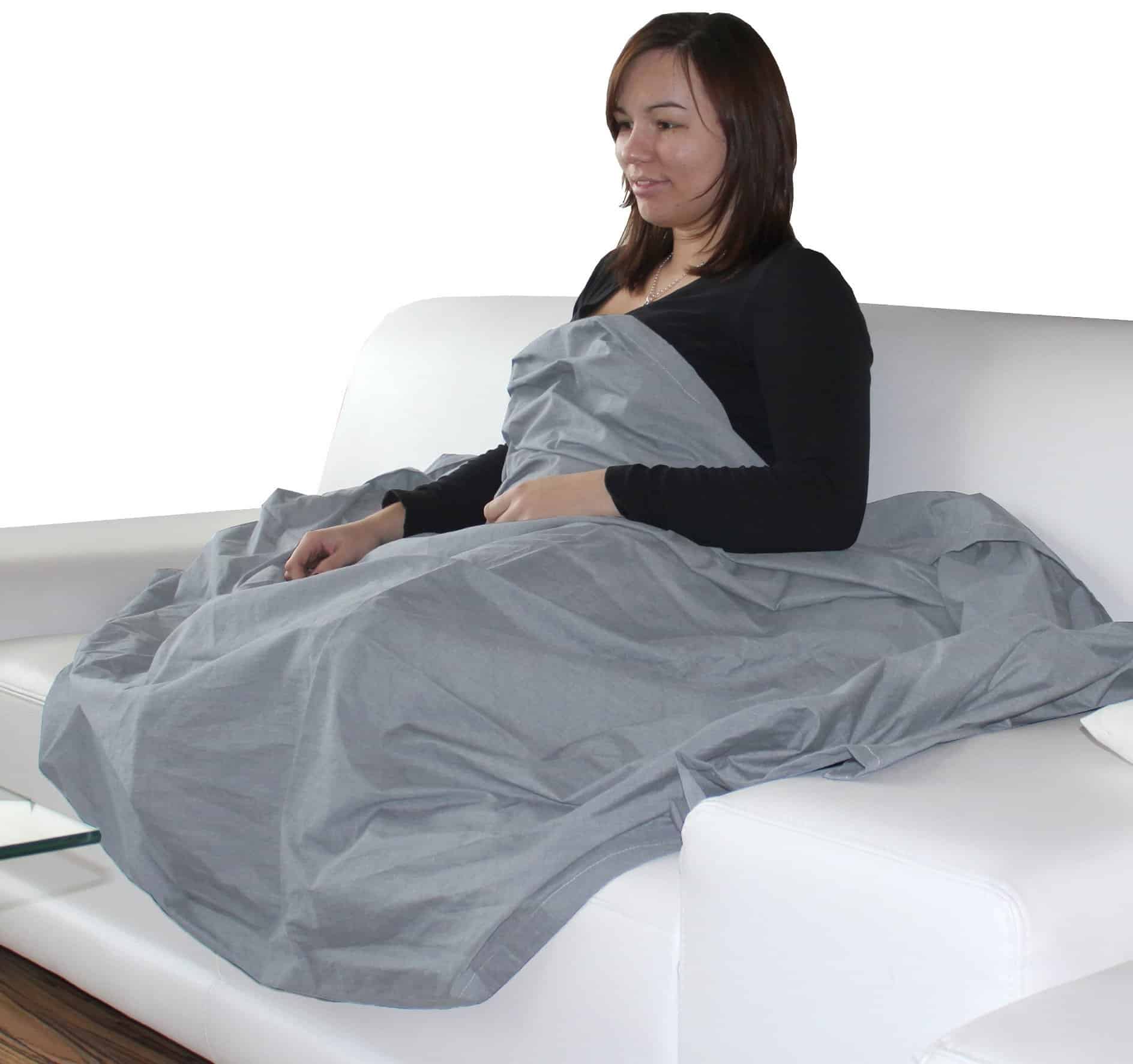 Esta manta de protección gris oscuro está hecha de Steel Active para proteger de los campos electromagnéticos de alta y baja frecuencia. Protección fácil y rápida en el sofá, en la cama, de vacaciones, en viajes de negocios o mientras juegas videojuegos. El Gris Acero es tejido de forma apretada y contiene hilos de acero que no son tan suaves en la piel, similar a un suéter de lana. Usa esta manta sobre la ropa para un uso cómodo. Utilizamos esta sustancia porque es extremadamente lavable y duradera, y dura más que cualquier otra sustancia.