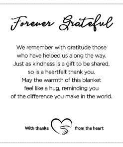 2. MENSAJE DE AGRADECIMIENTO SINCERO – Hermoso mensaje de gratitud Eternamente Agradecido (copyright Teri Harrison) viene grabado en un parche de cuero sintético de 5″x5″ que está cosido a la manta y transmitirá tu aprecio y gratitud al destinatario. Envolver esta manta especial hará que uno sienta el calor y la autenticidad de la gratitud ya sea cuando se acurruca en una silla favorita, viendo la televisión, leyendo, durmiendo o pasando tiempo al aire libre.