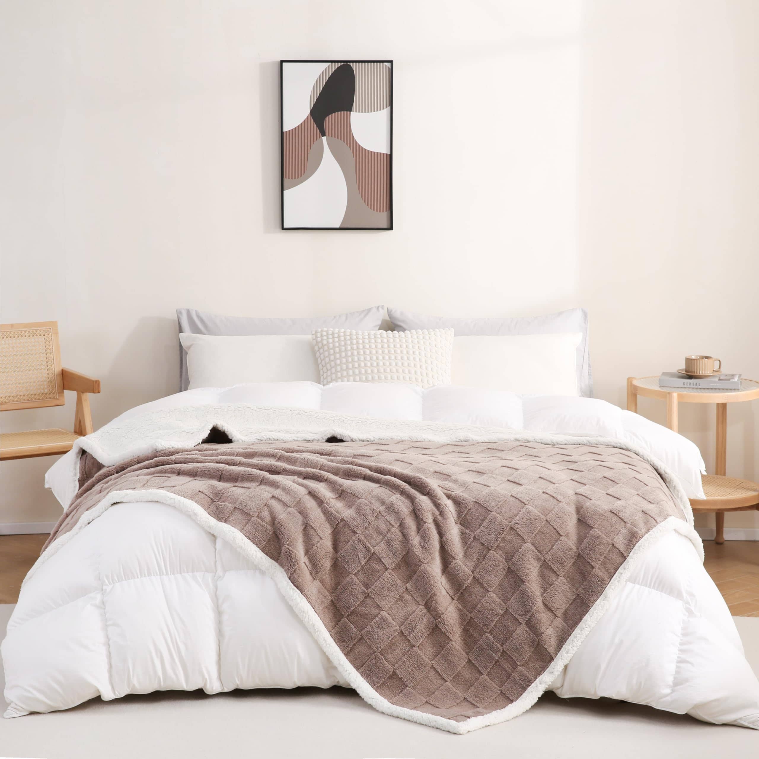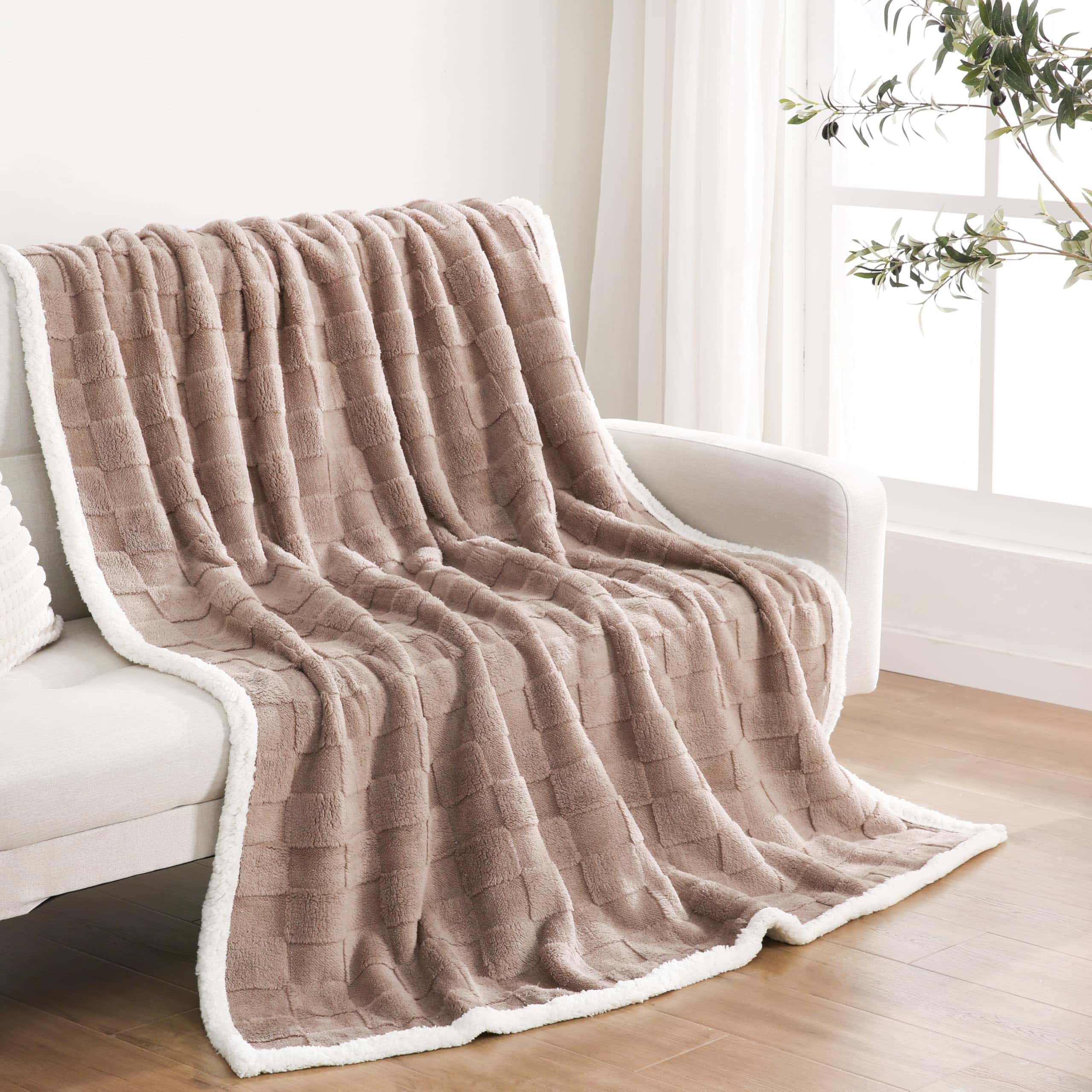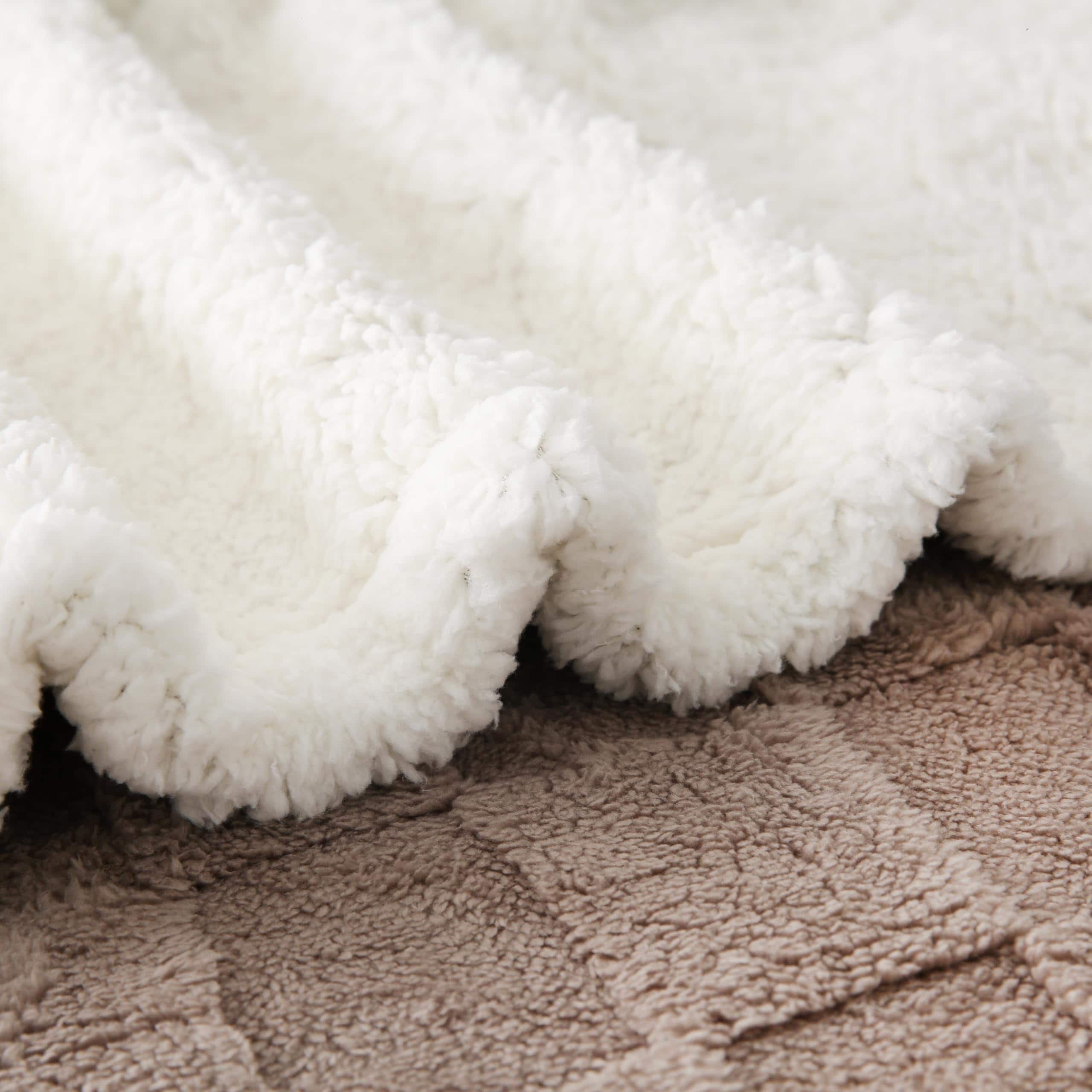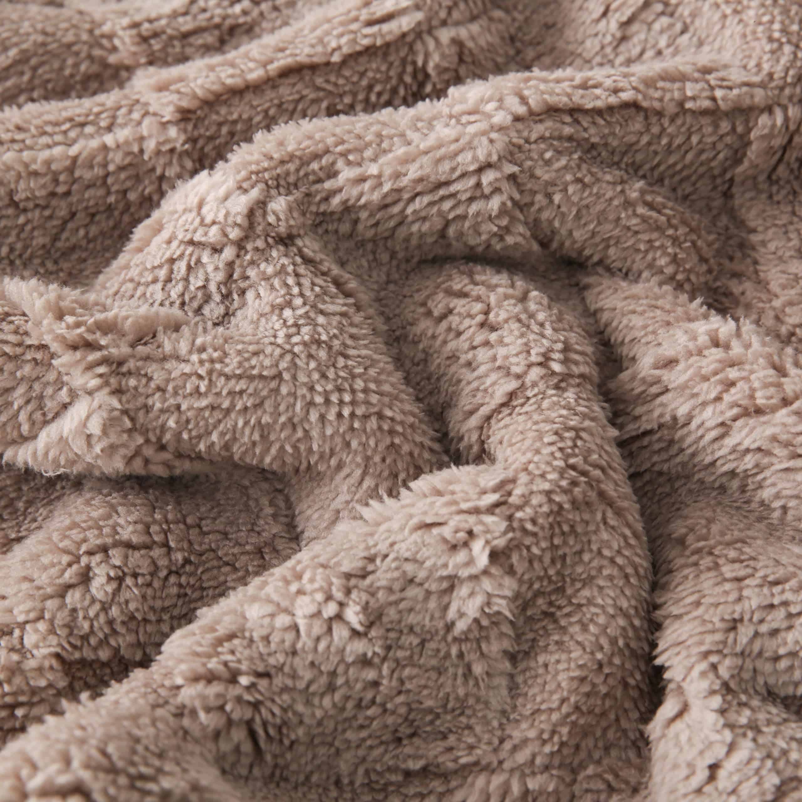 1. SUPER SUAVE Y CÁLIDA: La manta de sherpa está hecha de lana de felpa jacquard de 240GSM en un lado y sherpa súper suave de 220GSM en el lado opuesto, esta manta de doble cara de buena calidad es peluda, tupida y ultra acogedora para brindar comodidad elegante durante todo el año.