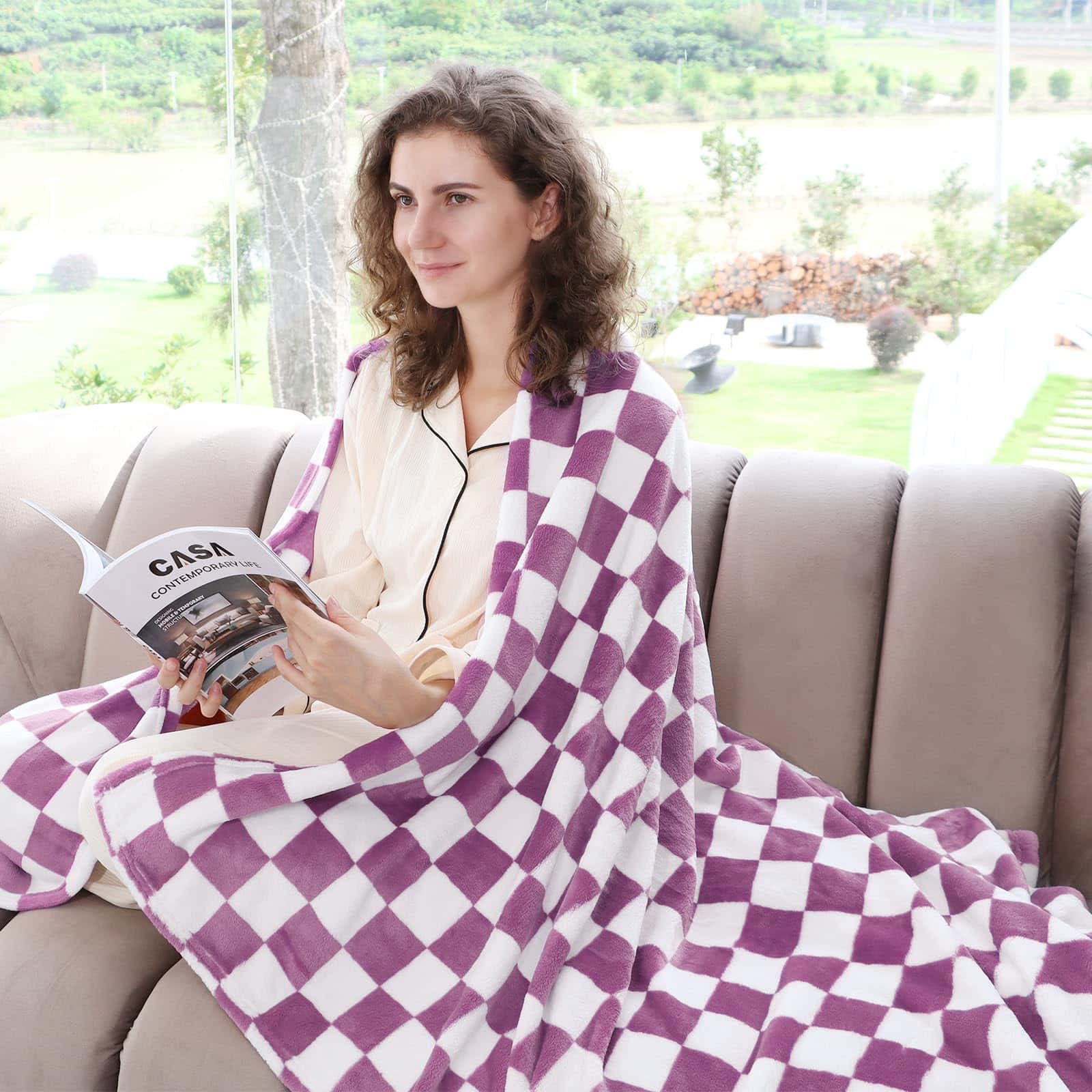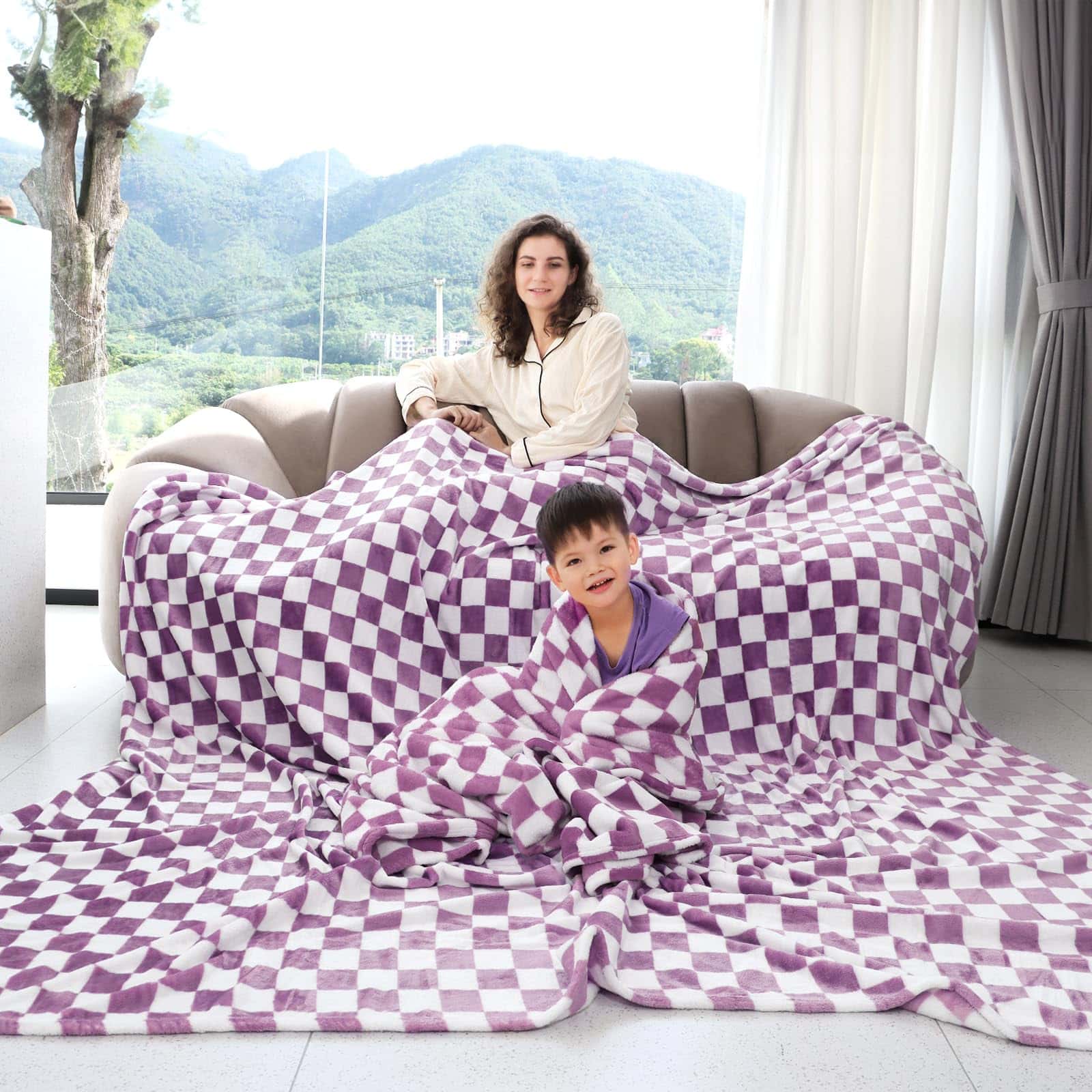 Manta Grande Morada a Cuadros para Cama Tamaño Queen, Suave