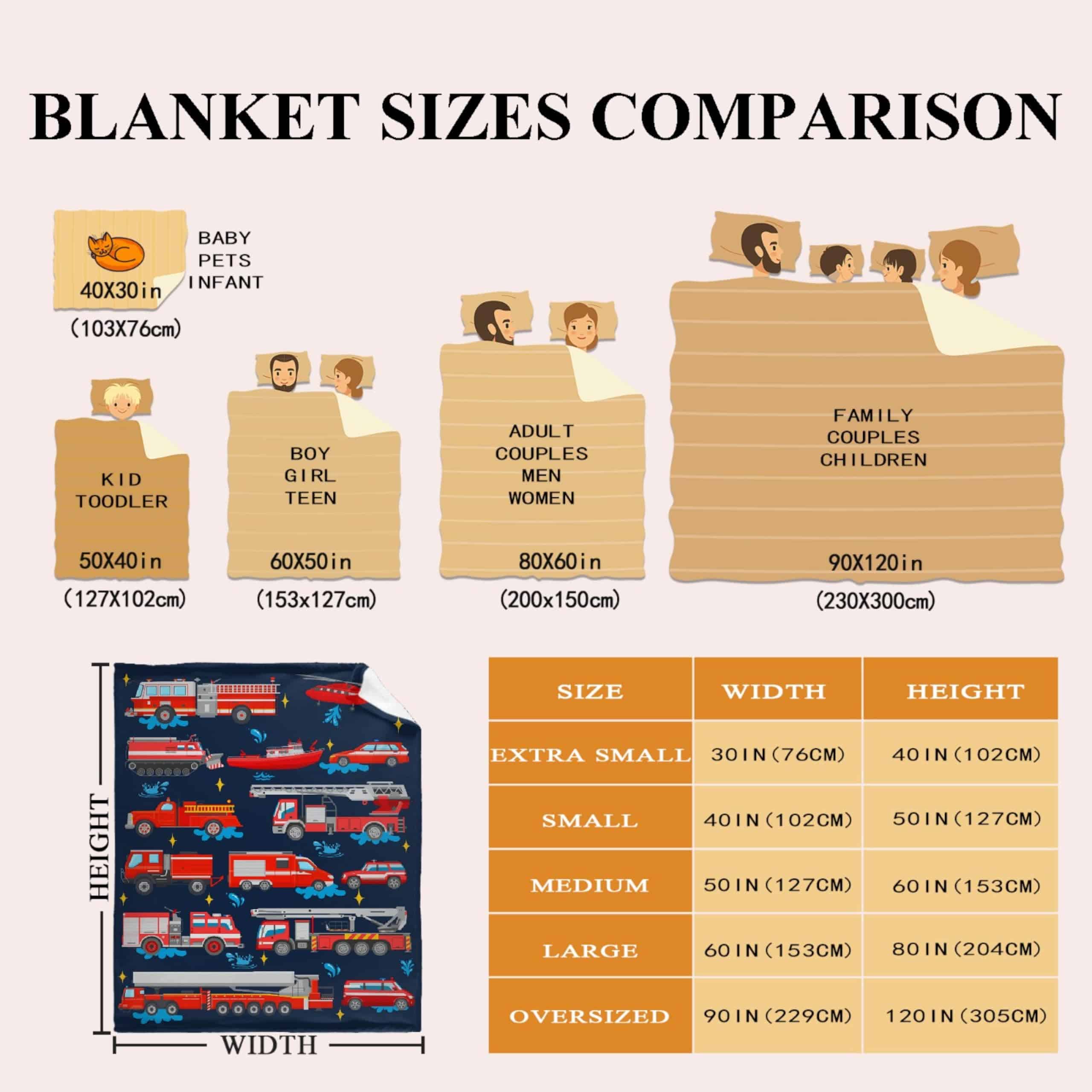 3. ELIGE ENTRE 5 TAMAÑOS: La manta Firetrucks Fire Engines Trucks está disponible en 5 tamaños, XS 40x30in es adecuada para cubrir las piernas o la mascota; S 50x40in es ideal para niños, viajes, avión y oficina; M 60x50in es adecuada para adolescentes; L 80x60in es adecuada para adultos; XL 120x90in es ideal para toda la familia.