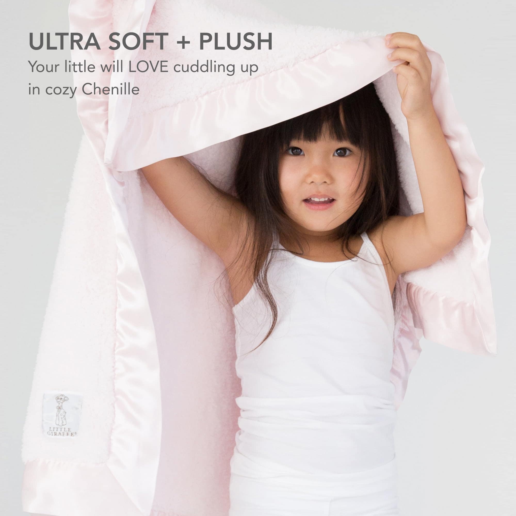 La misión de Little Giraffe es proporcionar a los consumidores los accesorios infantiles y para adultos más lujosos, exclusivos y sin complicaciones del mercado. Envuelve a tu pequeño en un lujo suave con nuestra manta de bebé de chenille. Esta manta súper acogedora tiene un ribete de satén a juego. Después de tocarla, rápidamente entenderás por qué tu hijo no querrá ir a ningún lado sin esta manta.