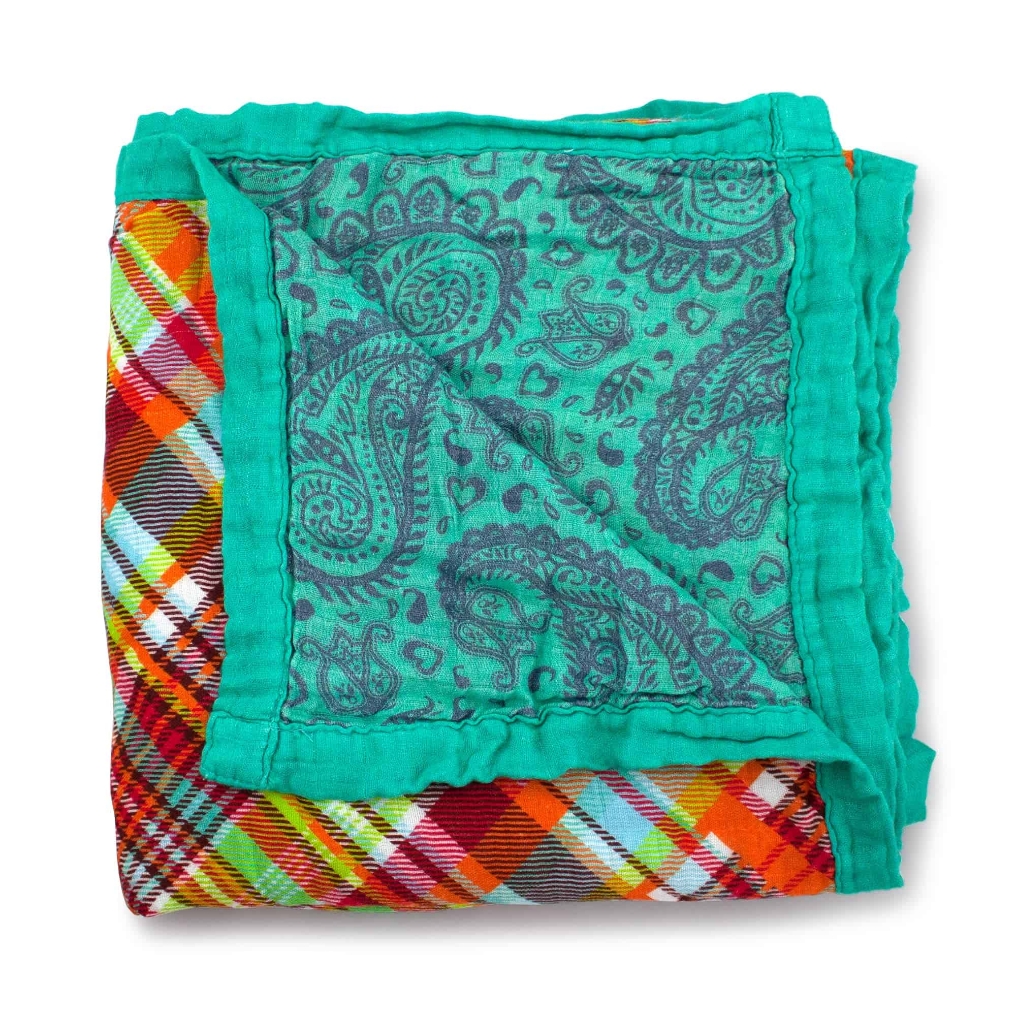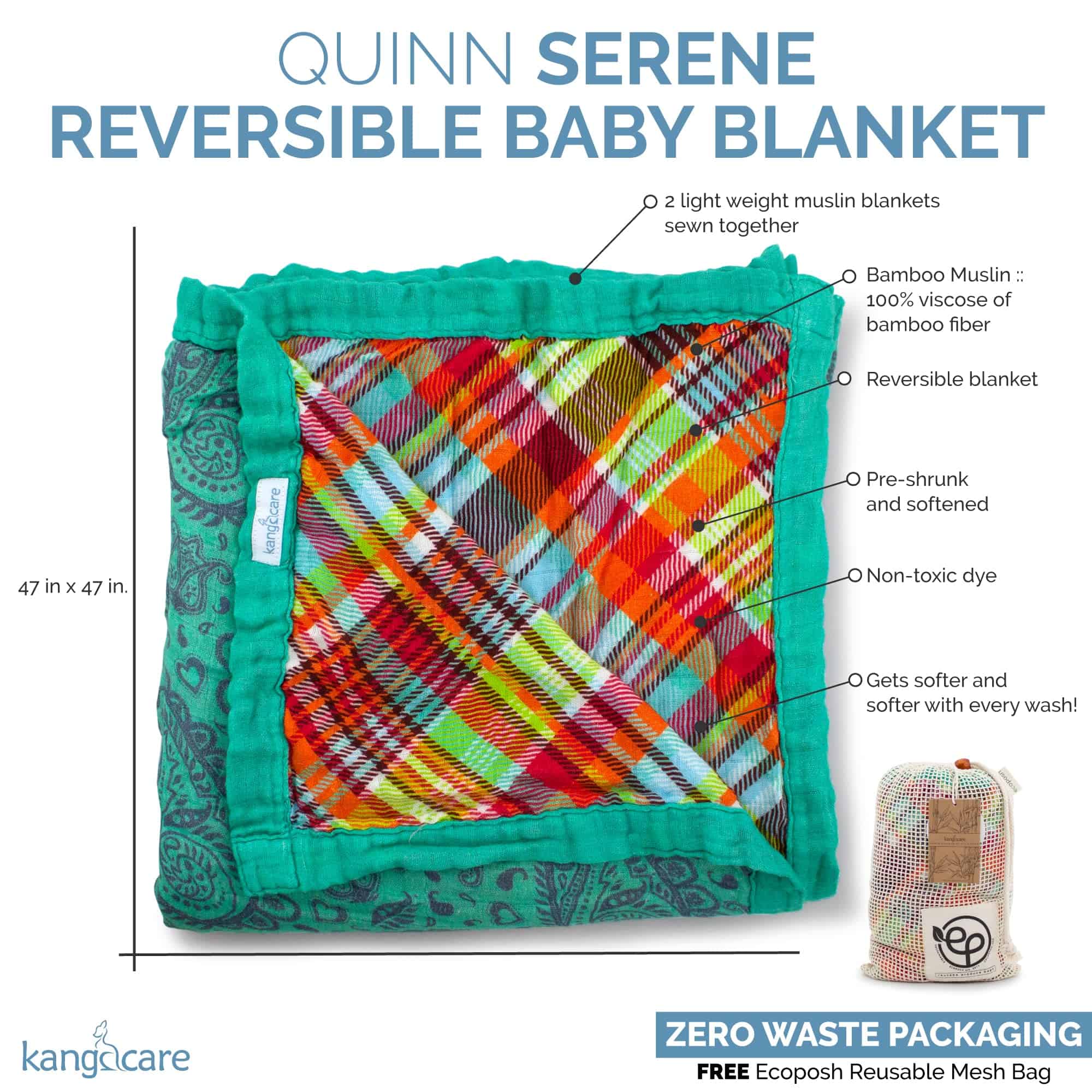 Manta de bebé reversible de doble capa Kanga Care Serene, hecha de viscosa de bambú premium de muselina. Esta manta única tiene 2 mantas ligeras de abrigo cosidas juntas, con un lado en cuadros favoritos en tonos de naranja, azul, verde, rojo, verde azulado, lima y tonos opacos donde se mezclan, y el otro lado en paisley verde azulado y corazones. Con un tamaño generoso de 47 pulgadas x 47 pulgadas, esta manta se vuelve más suave con cada lavado, ya que está pre-encogida y suavizada. Además, el tinte utilizado es no tóxico para la seguridad de tu bebé.