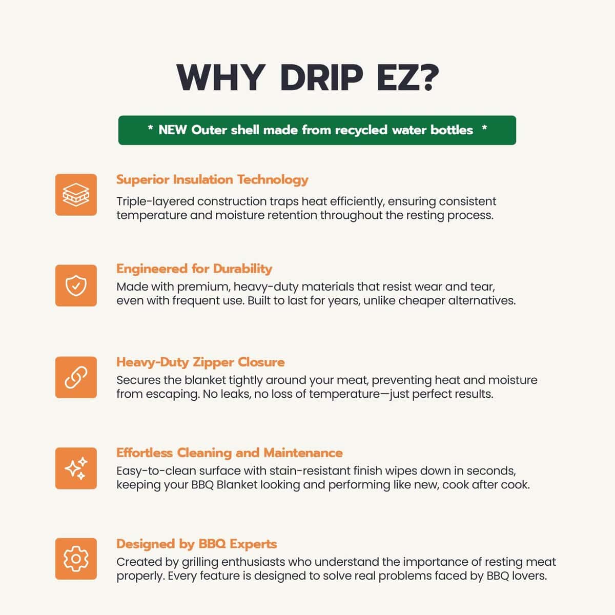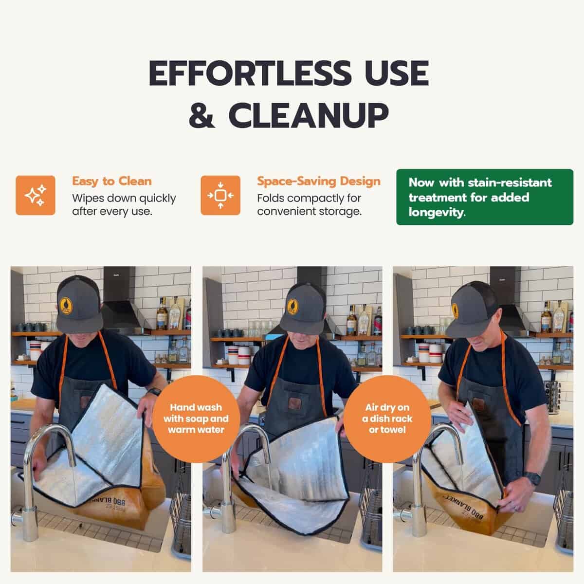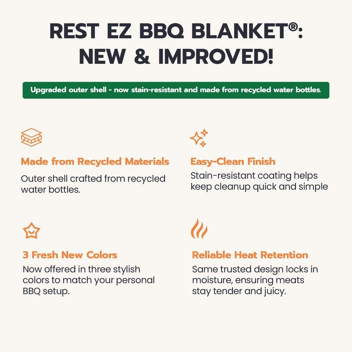 3. NUEVO Y MEJORADO: La capa exterior mejorada ahora está hecha de botellas de agua recicladas y terminada con resistencia adicional a las manchas. Es resistente, fácil de limpiar y está construido para manejar desorden real de barbacoa.
