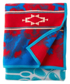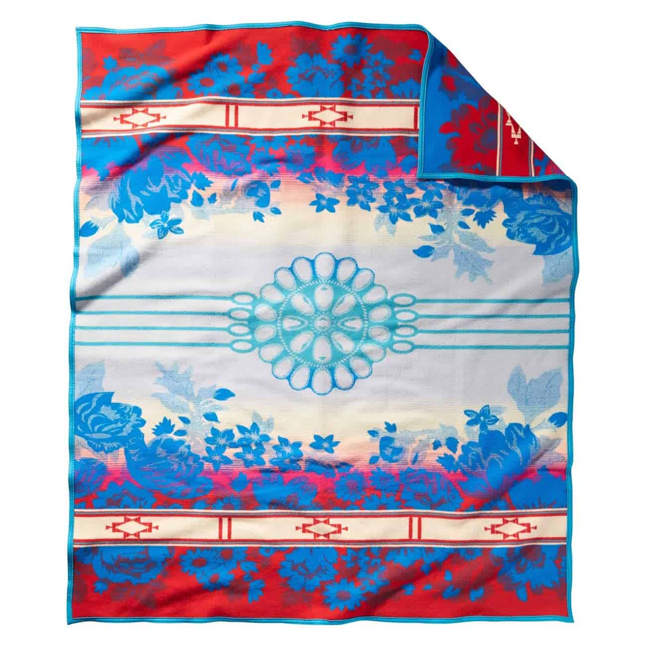 Al igual que el árbol de piñón, los miembros de la Nación Navajo reúnen recursos para sobrevivir a un suministro de agua cada vez más precario. La artista Diné Emma Robbins ha reunido símbolos de resistencia para este diseño; un pañuelo de sánii (abuela materna) cruzado por cinturones tradicionales usados en ceremonias y partos. En el centro, un brazalete de plata de una joven está incrustado con turquesa, una piedra formada por raras lluvias que fluyen a través de capas áridas de roca. Una porción de las ventas de la manta apoyará el Proyecto de Agua Navajo de DigDeep. Tamaño de la lana.