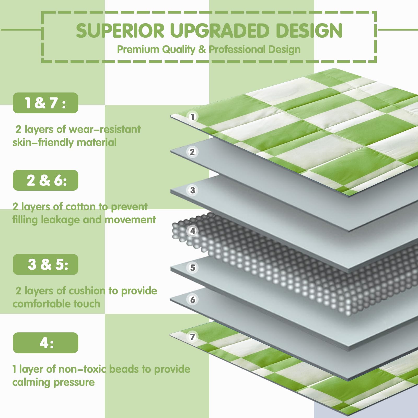 2. Libre de dificultades, reforzado con comodidad: En el núcleo de nuestra manta ponderada se encuentran materiales 100% microfibra y cuentas de vidrio premium, asegurando que tu tenga un gran confort al tocarla. Con un patrón de costura denso entrelazado en una estructura de 7 capas, las cuentas permanecen intactas dentro de los compartimentos sin dispersarse, permitiendo una mayor transpirabilidad a través de la manta, especialmente para las noches calurosas de verano.