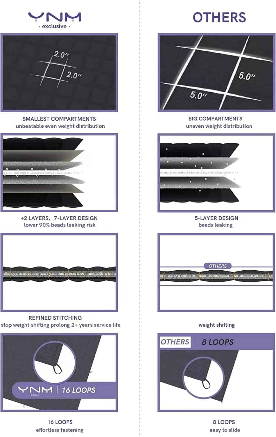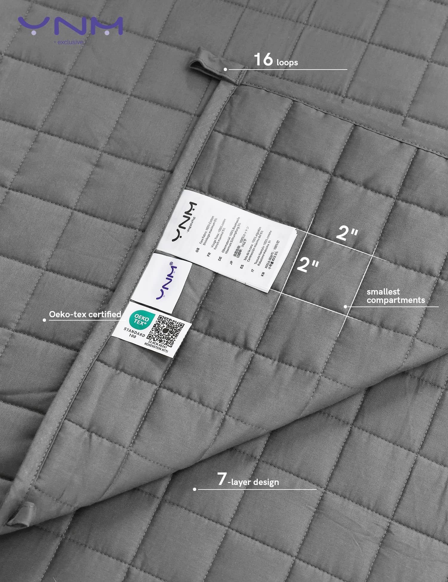 1. YNM VERSIÓN EXCLUSIVA ACTUALIZADA: 2 x2 compartimentos más pequeños. 2. Diseño Innovador El diseño de sistema de 7 capas se adapta a la curva de tu cuerpo para obtener el máximo confort y los compartimentos de 2×2 pulgadas permiten una distribución de peso más equitativa. Incluye más perlas de vidrio y menos fibra para una regulación de temperatura mejorada. Además, un método de costura de bloqueo de perlas tridimensionales evita fugas de perlas. Tiene la mejor costura (0.25mm por puntada) para evitar el movimiento de peso entre compartimentos. Todas estas características hacen que sea una manta excelente. 3. Experiencia de Sueño Única YnM proporciona un medio natural para calmar el cuerpo para una buena noche de sueño. Es una maravillosa manta sensorial para adultos y niños para ayudarles a relajarse y sentirse a gusto. Grandes regalos para tus seres queridos. 4. Guía de Talla Para obtener la talla adecuada para un adulto, toma el 10% de tu peso corporal y añade 1 libra. Por favor selecciona una manta ponderada de medidas 80×87 pulgadas o 88×104 pulgadas para compartir. 5. Funda de Edredón : Fundas de edredón transpirables de algodón/lino, fundas de edredón de bambú para mantenerse fresco o fundas de edredón minky acogedoras están disponibles en YnM. Desde YnM puedes encontrar la funda de edredón perfecta para ti y para proteger tu manta ponderada. 6. Cuidado Fácil Lavable a máquina en un ciclo suave. Secar en secadora a baja temperatura o secar al aire. Usa un detergente suave y evita la lejía. Si usas la manta ponderada YnM con una funda de edredón, entonces solo necesitas lavar la funda de edredón ligera en lugar de lavar la pesada manta ponderada interna. 7. Lazos Tiene 16 lazos resistentes para sujetar la funda de edredón (disponible por separado) y evitar resbalones. 8. Recordatorio Las mantas ponderadas no están destinadas a colgar en el borde de tu cama. Esto concentra el peso en las áreas donde más se necesita. ¡En ti! ¡Así que una manta ponderada es mucho más pequeña que una manta ordinaria.